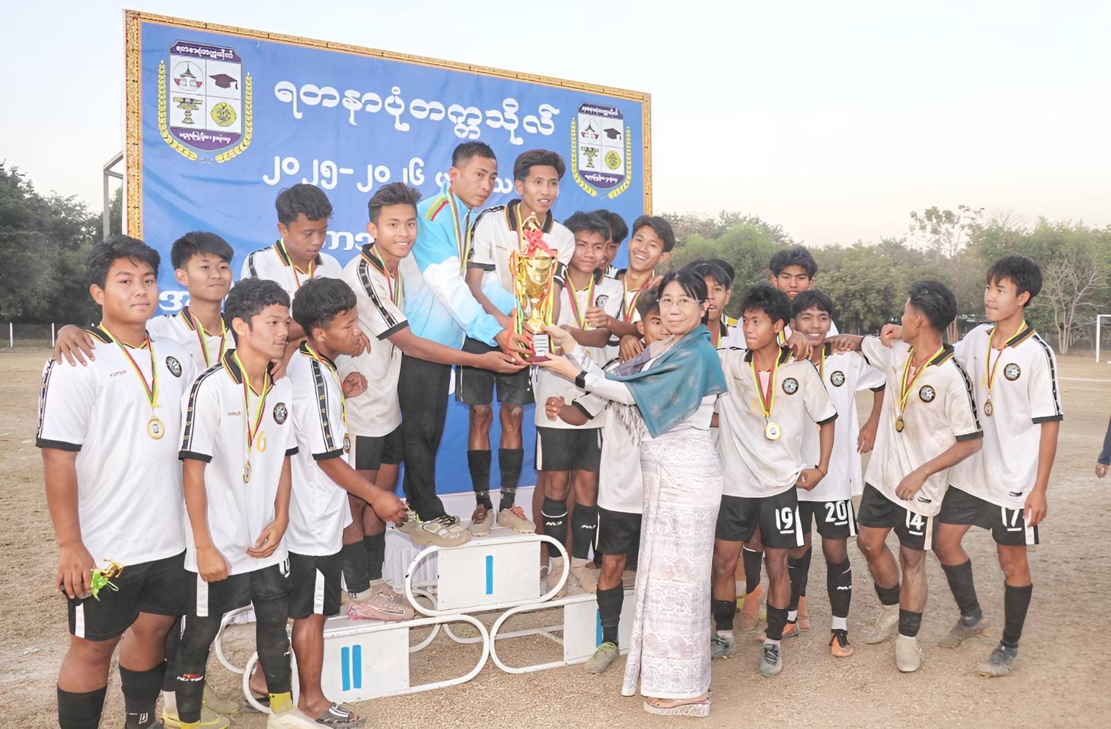 ထို့နောက် ဘောလုံးပြိုင်ပွဲကျင်းပရေးအားကစားဆပ်ကော်မတီဥက္ကဋ္ဌ ဒေါက်တာလဲ့လဲ့ဝင်း၊ အားကစားနှင့် ကာယပညာသိပ္ပံ(မန္တလေး)မှ ကျောင်းအုပ်ကြီး ဦးမြင့်ခိုင်၊ ဒုတိယပါမောက္ခချုပ် ဒေါက်တာဦးဝင်းနိုင်တို့က အမျိုးသားဘောလုံးပြိုင်တွင် ဒုတိယဆု၊ တတိယဆု ရရှိကြသည့် ပြိုင်ပွဲဝင်အားကစားသမားများအား တစ်ဦးချင်းဆုများ၊ နေရာအလိုက်အကောင်းဆုံးအားကစားသမားဆုများနှင့် ငွေသားဆုများကို ပေးအပ်ချီးမြှင့်ခဲ့ပြီး ပါမောက္ခချုပ် ဒေါက်တာတင့်မိုးသူဇာက အမျိုးသားဘောလုံးပြိုင်ပွဲတွင် ပထမဆုရ အားကစားပညာအသင်းအား တစ်ဦးချင်းဆု၊ ငွေသားဆုနှင့် တံခွန်စိုက်ဆုတို့ကို ပေးအပ်ချီးမြှင့်ကြောင်း သိရသည်။