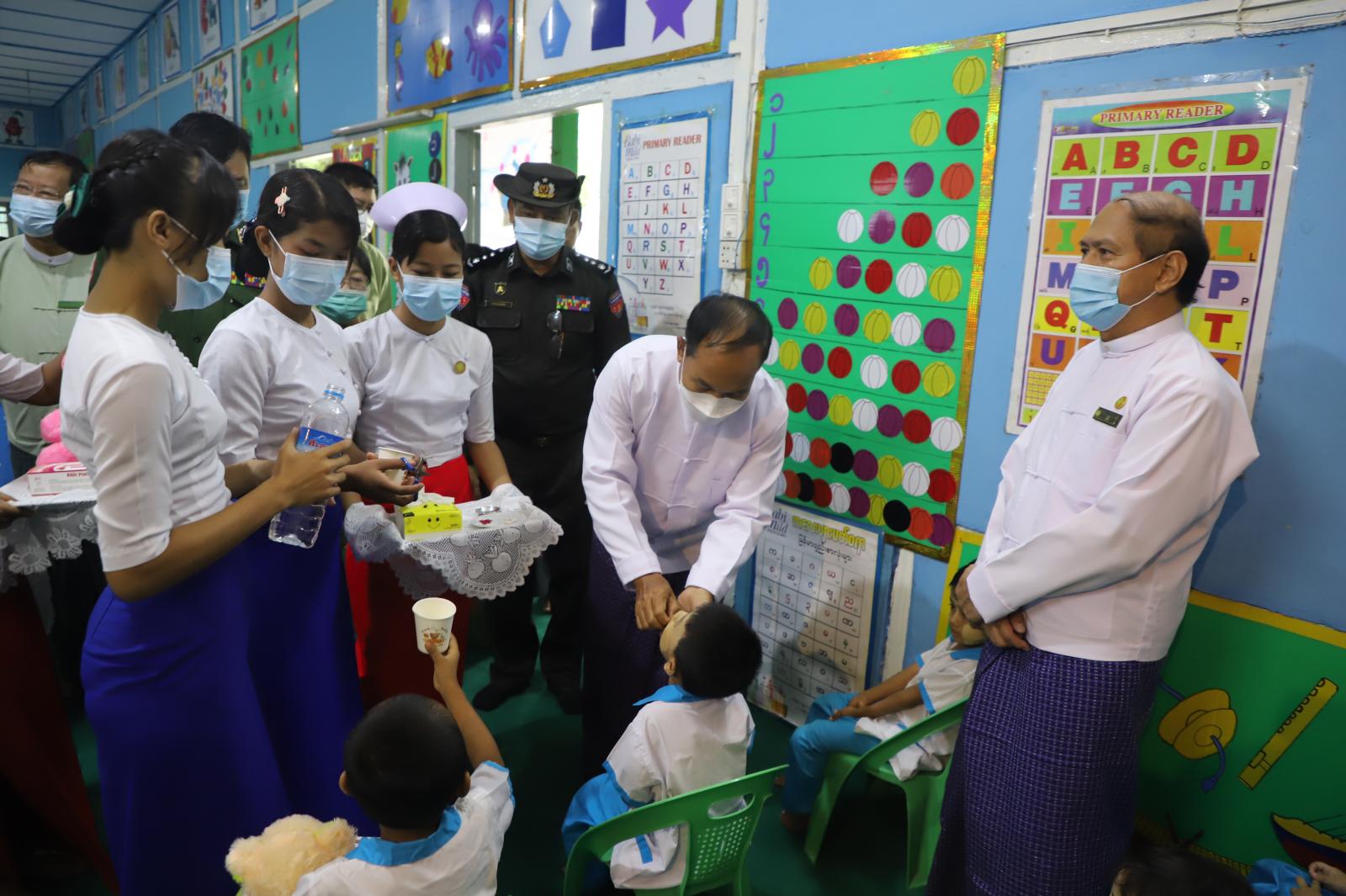 ဆက်လက်ပြီး တိုင်းဒေသကြီး ဝန်ကြီးချုပ်နှင့် တာဝန်ရှိသူများသည် မုံရွာမြို့ရှိ လူမူဝန် ထမ်းဦးစီးဌာနမှ ဖွင့်လှစ်ထားသော မူလတန်းကြိုကျောင်းသို့ ရောက်ရှိရာ ကလေးငယ်များအား ဗီတာမင်အေဆေးနှင့် သံချဆေးများတိုက်ကျွေးပြီး ကစားစရာအရုပ်များနှင့် သွားတိုက်ဆေးများအား တာဝန်ရှိသူများနှင့်အတူ ဝေငှပေးခဲ့ကြပြီး တိုင်းဒေသကြီး ဝန်ကြီးချုပ်က ဆရာမများ အတွက် သွားတိုက်ဆေးများ ပေးအပ်ခဲ့ကြောင်း သိရသည်။