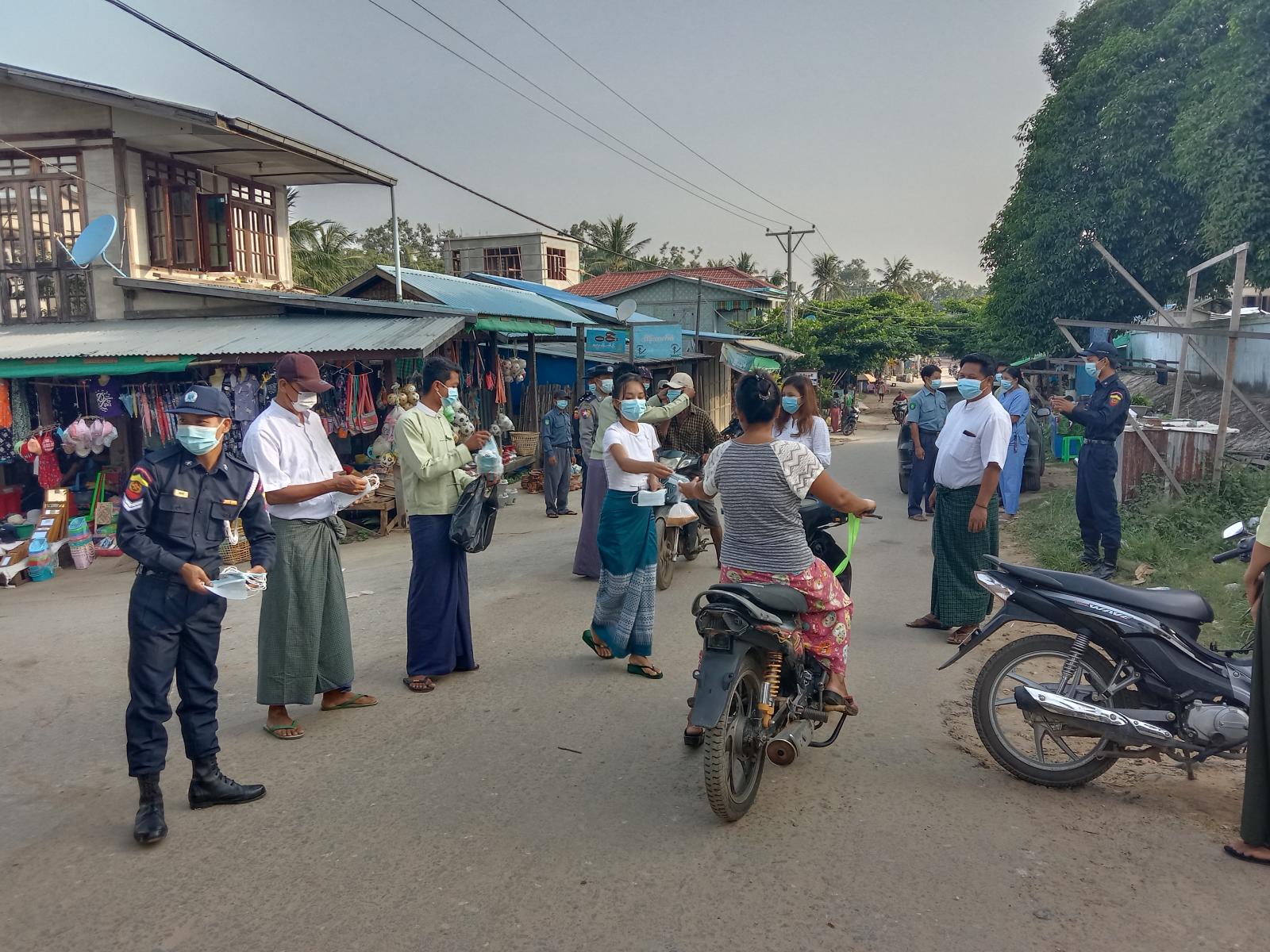 ထိုသို့ဆောင်ရွက်ရာတွင် မြို့အုပ်ချုပ်ရေးမှူး ဦးဇော်လင်းနိုင် ဦးဆောင်ကာ တကောင်းနယ် မြေစခန်းမှူး ရဲအုပ်အောင်ကိုဝင်းနှင့် တပ်ဖွဲ့ဝင်များ၊ ဌာနဆိုင်ရာများ၊ ရပ်ကျေးအုပ်ချုပ်ရေးမှူးများ ပူးပေါင်းကာ မြို့တွင်းသို့ ဝင်၊ ထွက်သွားလာသည့် ပြည်သူများ၊ ဈေးရောင်းသူ၊ ဈေးဝယ်သူများအား နေအိမ်ပြင်ပ သို့ထွက်ခွာသည့် အခါတိုင်းနှာခေါင်းစည်း (Mask)ကို မဖြစ်မနေစနစ်တကျ တပ်ဆင် ပြီးမှ သွားလာကြရန်၊ မိမိတို့ဒေသတွင် ကူးစက်မှုများမရှိသေးသည့်အတွက် ပြည်သူများအနေဖြင့် ကျန်းမာရေးဦးစီးဌာနမှ ထုတ်ပြန်ထားသည့် ညွှန်ကြားချက်များနှင့်အညီ သွားလာနေထိုင်ကြရန် စသည့်ကျန်မာရေးအသိပညာပေးများဆောင်ရွက်ပြီး ဈေးသူ/ဈေးသားများနှင့် ဈေးဝယ်နေသူများ အား နှာခေါင်းစည်း (Mask) များ အခမဲ့ဖြန့်ဝေပေးခဲ့ကြောင်း သိရသည်။