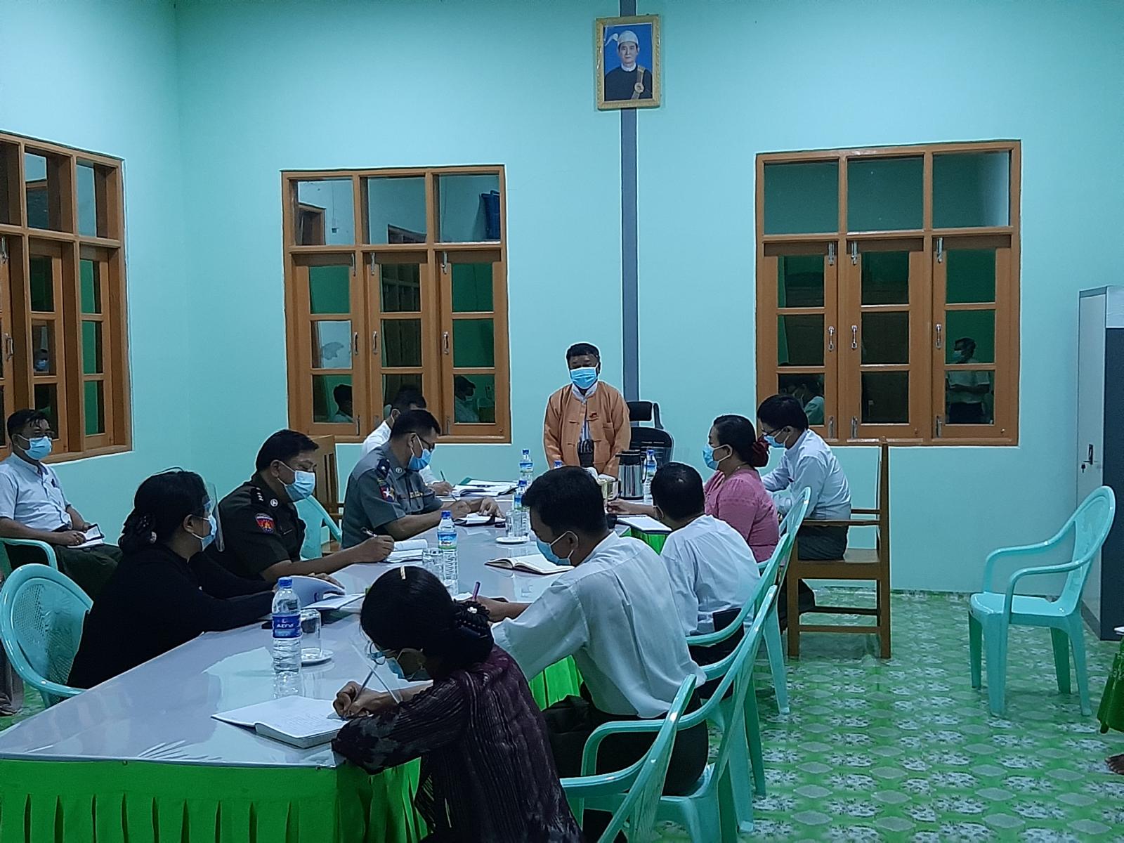 ထို့နောက် မြို့နယ်ကိုဗစ်-၁၉ ရောဂါကာကွယ်ထိန်းချုပ်ရေးနှင့်အရေးပေါ်တုန့်ပြန်ရေး ကော်မတီ ဥက္ကဋ္ဌ ဦးသိုက်ထွန်းနှင့် တာဝန်ရှိသူများက ရောဂါပိုးတွေ့ရှိလူနာနှင့်ထိတွေ့ခဲ့သူများကို ကျန်းမာရေးစောင့် ရှောက်မှုလုပ်ငန်း ဆောင်ရွက်ပေးနေမှုများ၊ မြို့နယ်အတွင်း ကိုဗစ်-၁၉ရောဂါ ကာကွယ်ထိန်းချုပ်ရေး လုပ်ငန်းများကို ကျန်းမာရေးနှင့်အားကစားဝန်ကြီးဌာန၏ ညွှန်ကြားချက်များနှင့်အညီ အရှိန်အဟုန်မြှင့် ဆောင်ရွက်ပေးနေမှုများနှင့် ကျန်းမာရေးဌာနအတွက် ယာဉ်မောင်းလိုအပ်ချက်များကို ပြန်လည် တင်ပြခဲ့ရာ လူမှုရေးဝန်ကြီးနှင့် တိုင်းကျန်းမာရေးမှ တာဝန်ရှိသူများက လိုအပ်သည်များကို ညှိနှိုင်းဆွေးနွေးခဲ့သည်။