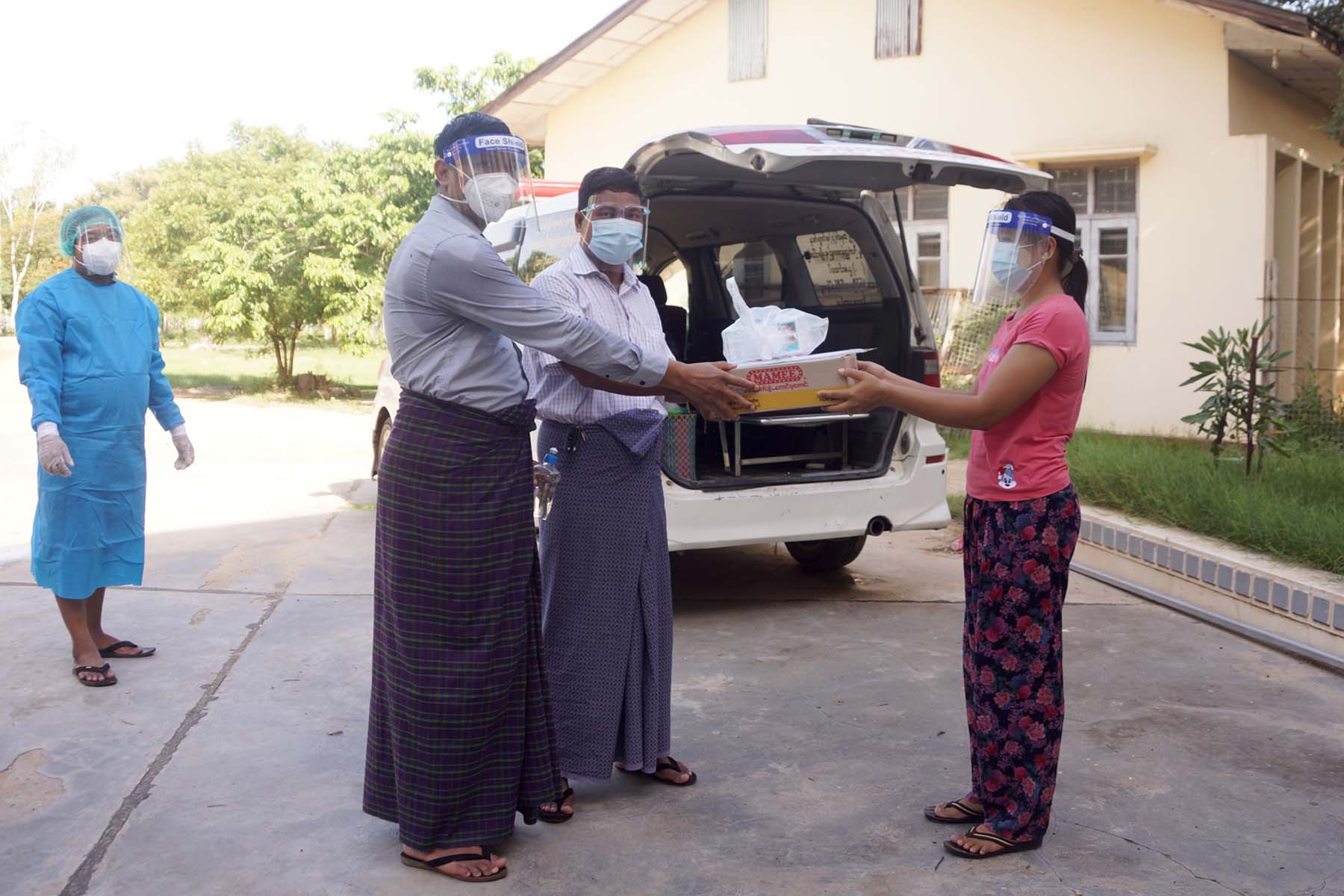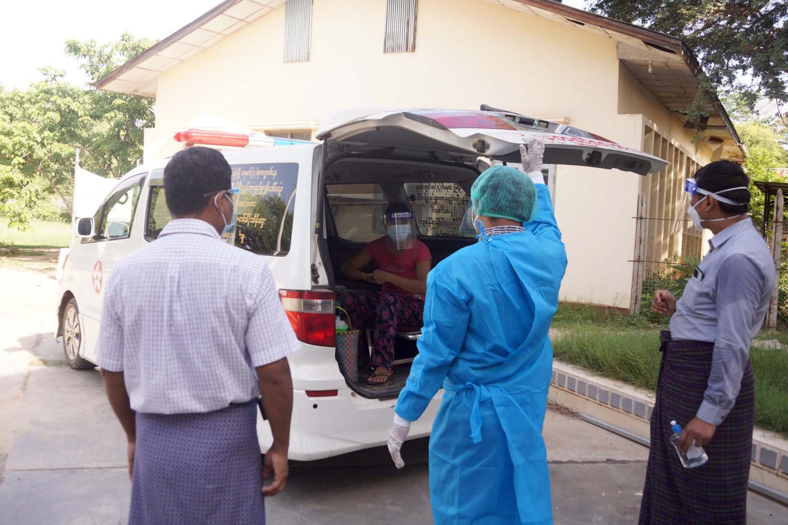 ဆေးရုံဆင်းခွင့်ရရှိသည့် ကိုဗစ်-၁၉ ရောဂါအတည်ပြုလူနာအား မြင်းခြံမြို့ အဖြူရောင်လက်များ ပရဟိတ အသင်းကားဖြင့် အိမ်အရောက် လိုက်လံပို့ဆောင်ပေးခဲ့သည်။