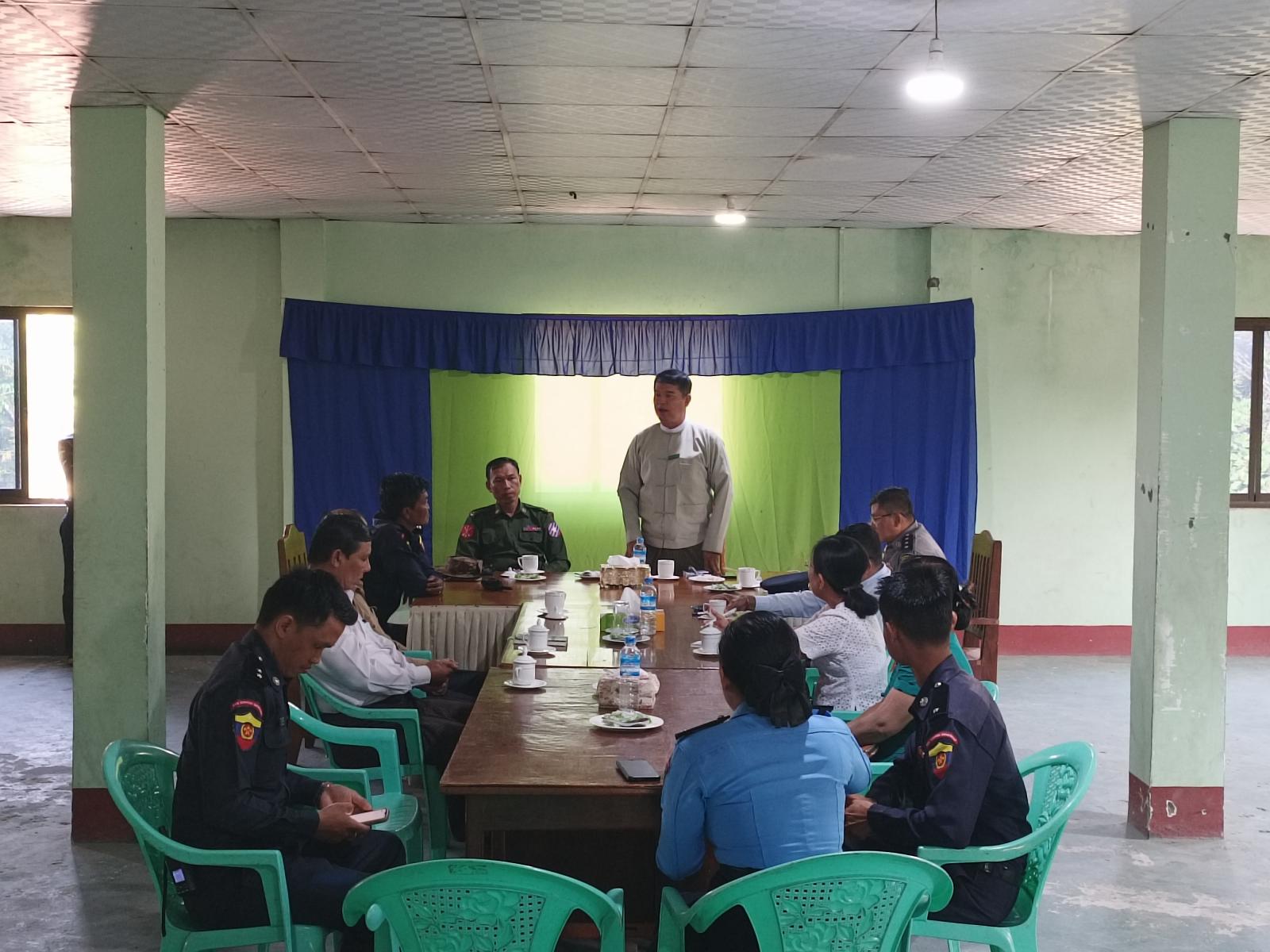 ထို့နောက် တက်ရောက်လာကြသည့် မြို့နယ်စီမံအုပ်ချုပ်ရေးအဖွဲ့၊ အဖွဲ့ဝင် ဗိုလ်မှူးသက်ထွန်းဦး၊ မြို့မရဲစခန်းမှ ရဲမှူးမိုးမြင့်၊ ဌာနဆိုင်ရာတာဝန်ရှိသူများ၊ ရပ်ကွက်အုပ်ချုပ်ရေးမှူး၊ မြို့နယ်ကြက်ခြေနီတပ်ဖွဲ့မှူး ဦးစိုးမင်းတို့မှ ကဏ္ဍအလိုက် တင်ပြဆွေးနွေးရာ တာဝန်ရှိသူမှလည်း မီးဘေးအန္တရာယ်၊ သဘာဝဘေးအန္တရာယ်များနှင့် ပတ်သက်၍ ကြိုတင်စီမံထားရမည့် အကြောင်းအရာများကို အားလုံးမှပူးပေါင်း ဆောင်ရွက်ကြစေရေး ညှိနှိုင်းဆွေးနွေးခဲ့ကြောင်း သိရသည်။