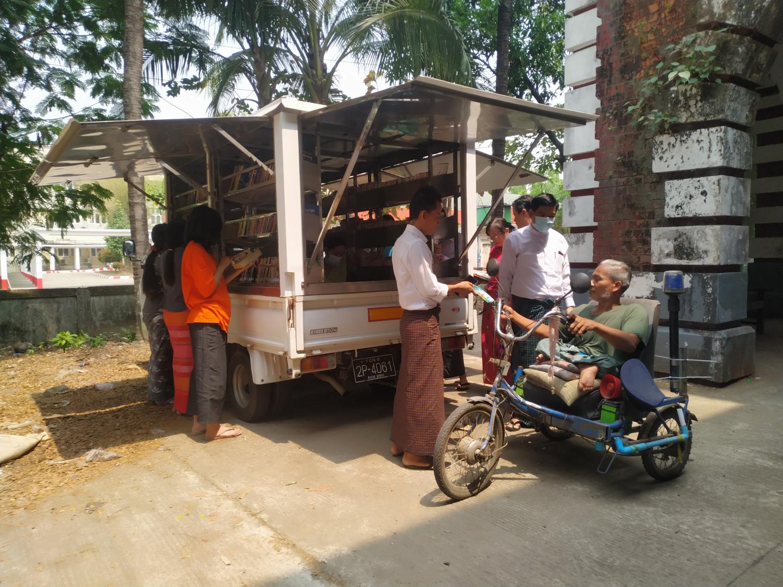 ရန်ကုန်တိုင်းဒေသကြီး၊ အင်းစိန်ခရိုင်၊ အင်းစိန်မြို့နယ်၌ ပြည်သူများနှင့်ဝန်ထမ်းများ စာပေမှရရှိသည့် ဗဟုသုတများစွာရရှိစေရန်နှင့်စာပေကို လက်ဝယ်အရောက် ဖတ်ရှုနိုင်စေရန် ရည်ရွယ်၍ ရွေ့လျားစာကြည့်တိုက်မော်တော်ယာဥ်ဖြင့် စာအုပ်များ ငှားရမ်းပေးခြင်းကို ယနေ့ နံနက်(၁၀)နာရီအချိန်က အင်းစိန်မြို့နယ်၊ အထွေထွေအုပ်ချုပ်ရေးဦးစီးဌာန(စုပေါင်းရုံး)သို့ သွားရောက်ငှားရမ်းပေးသည်။