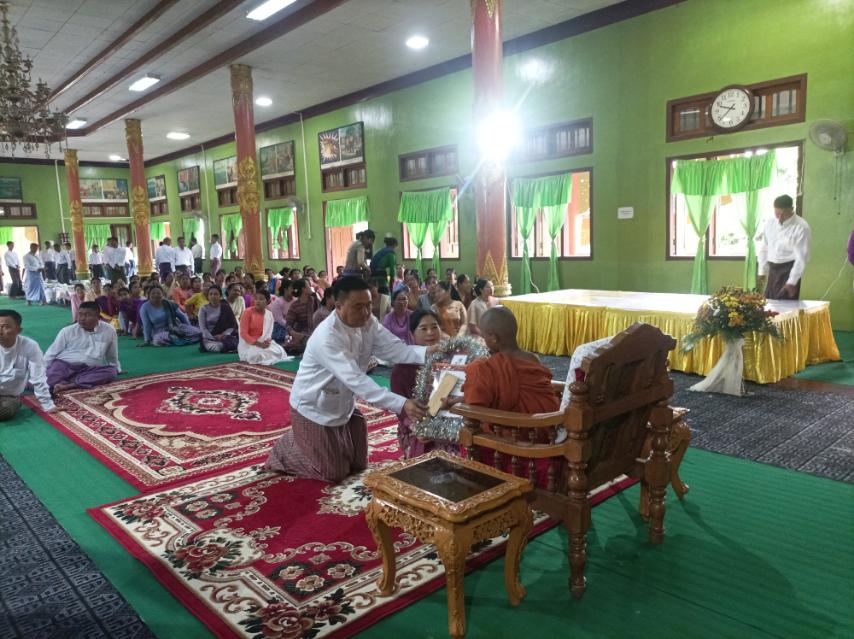 ဆက်လက်ပြီး ဆရာတော်သံဃာတော်များထံမှ သရဏဂုံသုံးပါးနှင့် ငါးပါးသီလခံယူ ဆောက်တည်ခြင်း၊ သံဃာတော် အရှင်သူမြတ်တို့ထံမှ ပရိတ်တရားများ နာယူခြင်း၊ လှူဖွယ် ပစ္ဓည်းများ ဆက်ကပ်လှူဒါန်းကြပြီး မြို့မကျောင်းဆရာတော် ဘဒ္ဒန္တစန္ဒနာလင်္ကာရထံမှ လှူဒါန်းမှုအစုစုအတွက် ရေစက်သွန်းချ အနုမောဒနာတရား နာယူ၍ အမျှအတန်းပေးဝေခဲ့ ကြကြောင်း သိရသည်။