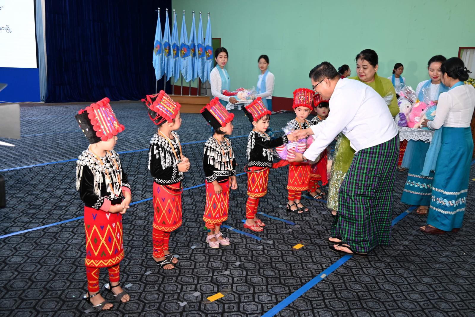 ထို့နောက် ပြည်နယ်ဝန်ကြီးချုပ်နှင့် ဇနီးဒေါ်နန်ဆိုင်း၊ ပြည်နယ်ဝန်ကြီးများနှင့် ၎င်းတို့၏ဇနီးများ၊ ပြည်နယ်အမျိုးသမီးရေးရာအဖွဲ့ဝင်များက အခမ်းအနားတက်ရောက်လာကြသည့် ရင်သွေးငယ်များအား အမှတ်တရ လက်ဆောင်များကို ပေးအပ်ခဲ့ကြပြီး လူမှုဝန်ထမ်းဦးစီးဌာန၊ အမှတ်(၁)မူလတန်းကြိုကျောင်း ရင်သွေးငယ်များက ပြည်နယ်ဝန်ကြီးချုပ်နှင့် အဖွဲ့ဝင်များအား အမှတ်လက်ဆောင်များကို ပြန်လည် ပေးအပ်ခဲ့ကြသည်။