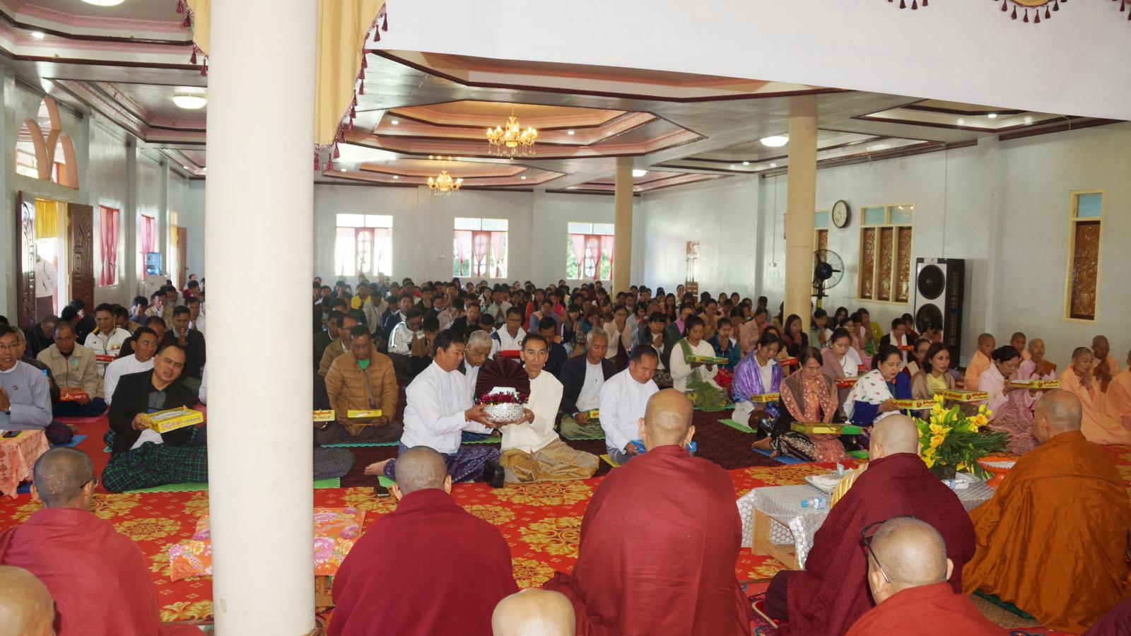 အခမ်းအနားတွင် အခမ်းအနားတက်ရောက်လာသည့် ပင့်သံဃာတော်များနှင့် ဧည့်ပရိသတ်အပေါင်းတို့က နမောတဿ သုံးကြိမ်ရွတ်ဆို ဘုရားကန်တော့၍ အခမ်းအနားကို စတင်ဖွင့်လှစ်ပြီး ဧည့်ပရိသတ်အပေါင်းတို့က ပူတာအိုမြို့နယ် ဆာရ်ခွမ်ဒမ်းကျေးရွာ ရေခဲတောင်ကျောင်းတိုက် ဆရာတော်ထံမှ ရှစ်ပါးသီလ ခံယူဆောက်တည်ကြသည်။ ဆက်လက်၍ ဆရာတော်၊ သံဃာတော်၊ အရှင်သူမြတ်တို့က ပရိတ်တရားတော်များ ချီးမြှင့်တော်မူကြပြီး ခရိုင်စီမံအုပ်ချုပ်ရေးအဖွဲ့ ဉက္ကဌ ဦးခေါင်လန်ဒီးနှင့်အဖွဲ့ဝင်များ၊ ဒုတိယခရိုင်အုပ်ချုပ်ရေးမှူး ဦးသန်းထွေး၊ မြို့နယ်စီမံအုပ်ချုပ်ရေးအဖွဲ့ဉက္ကဌ ဦးကျော်ကျော်လွင်နှင့်အဖွဲ့ဝင်များ၊ ခရိုင်/မြို့နယ် ဌာနဆိုင်ရာများနှင့်အလှူရှင်များက ကထိန်လျာသင်္ကန်း၊ အခြံအရံသင်္ကန်းနှင့် လှူဖွယ်ဝတ္တုများကို ဆရာတော်၊ သံဃာတော်များထံ ဆက်ကပ်လှူဒါန်းခဲ့ကြသည်။
