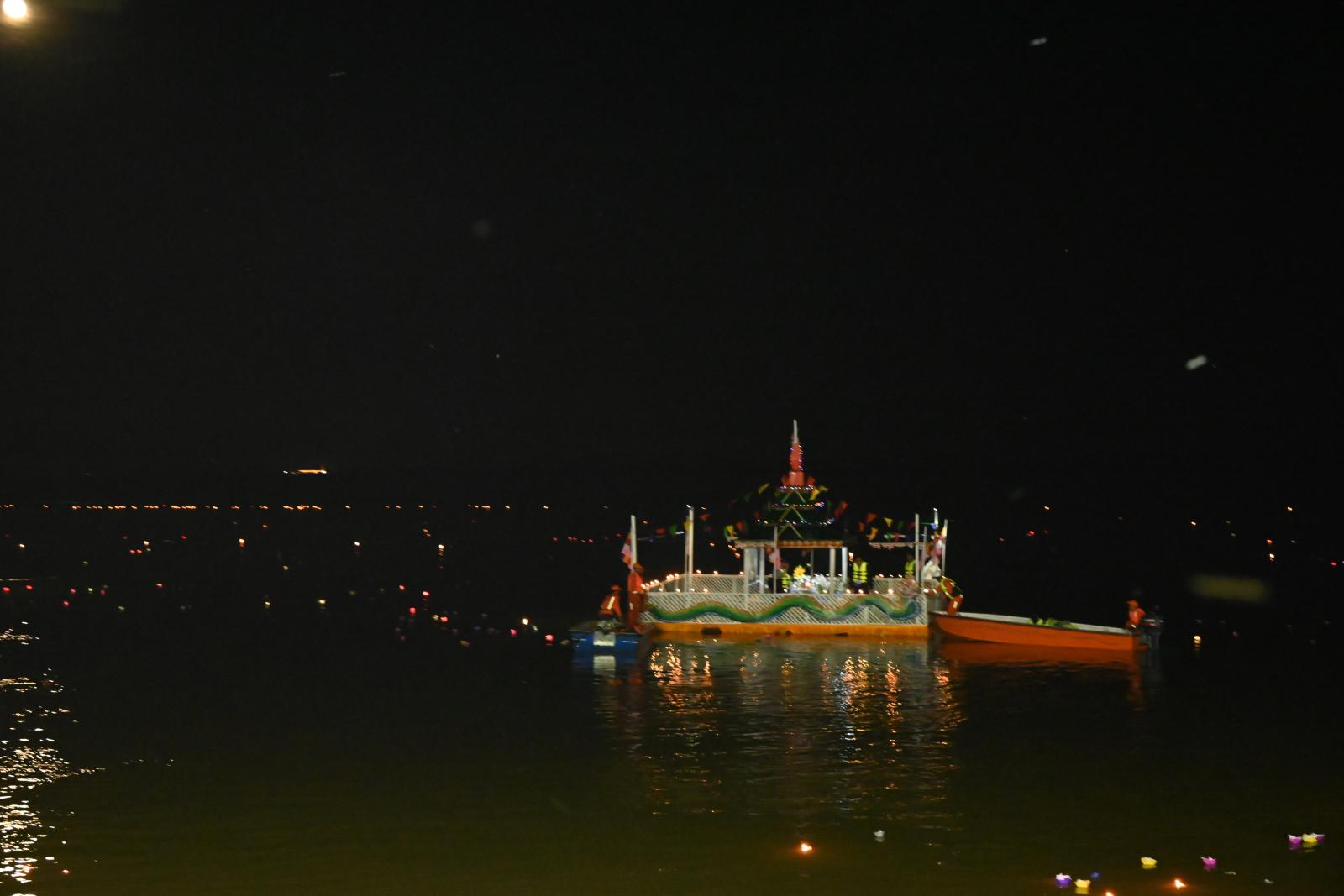 ထို့အပြင် မြစ်ကြီးနားမြို့ ဧရာဝတီမြစ်အတွင်း၌လည်း ရှင်ဥပဂုတ္တမထေရ်ဖောင်တော်နှင့် ဆီမီး ၂၀၀၀၀ ရေမျှောပူဇော်ပွဲအခမ်းအနားကို ကျင်းပပြုလုပ်ရာ လောကမာန်အောင်ဆုတောင်းပြည့် စေတီတော်အနီး ဧရာဝတီမြစ်ကမ်းနားမှ လည်းကောင်း၊ ဧရာဝတီမြစ်အတွင်းမှ စက်လှေများဖြင့် လည်းကောင်း ဌာနဆိုင်ရာများနှင့် ဒေသခံပြည်သူအများအပြားက ရှင်ဥပဂုတ္တဖောင်တော်နှင့်အတူ ဆီမီး ၂၀၀၀၀ ထွန်းညှိ၍ ရေမျှောပူဇော်ကြရာ ပြည်နယ်ဝန်ကြီးချုပ်၊ ပြည်နယ်တရားလွှတ်တော် တရားသူကြီးချုပ်၊ မြောက်ပိုင်းတိုင်းစစ်ဌာနချုပ် တိုင်းမှူး၊ ဒုတိယဝန်ကြီး၊ ပြည်နယ်ဝန်ကြီးများ၊ ပြည်နယ်အဆင့် ဌာနဆိုင်ရာများက ကမ်းနားလမ်းနှင့် ရုံးကြီးလမ်းဆုံ မြစ်ကမ်းဘေးမှ ပူဇော်ခဲ့ကြပြီး မီးပုံးပျံများကို လွှတ်တင်ပူဇော်ခဲ့ကြသည်။