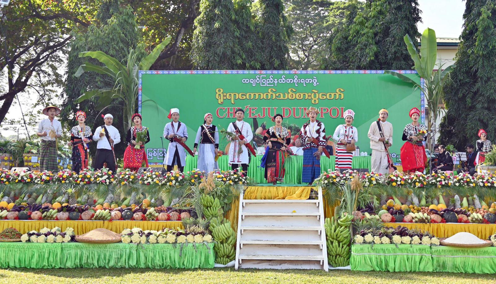 ထို့နောက် ပြည်နယ်အထွေထွေအုပ်ချုပ်ရေးဦးစီးဌာနမှ တိုင်းရင်းသား/သူလေးများက ကချင် တိုင်းရင်းသားတို့၏ ရိုးရာကောက်သစ်စားပွဲတော် တေးသီချင်းအကအလှများဖြင့် ကပြဖျော် ဖြေတင်ဆက်မှုကို တက်ရောက်လာကြသူများက ကြည့်ရှုအားပေးခဲ့ကြပြီး တစ်နှစ်တာအတွင်း ဦးစွာ ရရှိသည့် ဆန်/ကောက်သစ်ကို နေ့လယ်စာအဖြစ် အတူတကွ ပျော်ရွှင်စွာ သုံးဆောင်ခဲ့ကြသည်။