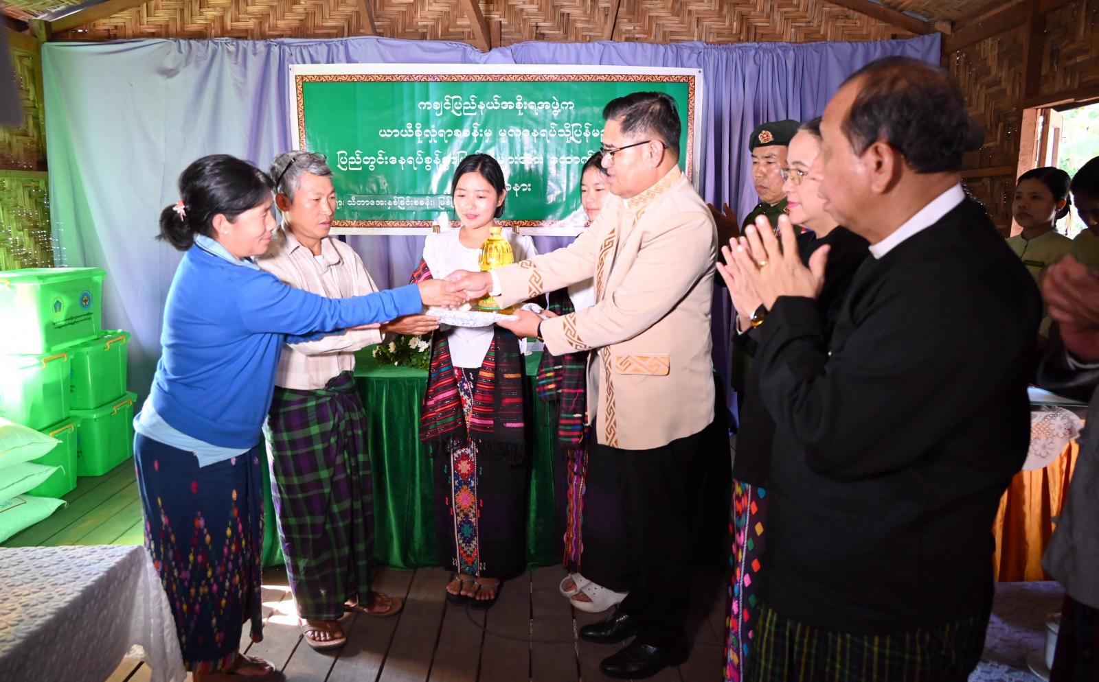 ယင်းနောက် ပြည်နယ်ဝန်ကြီးချုပ်နှင့် တာဝန်ရှိသူများက သီတာအေးနှစ်ခြင်း IDP စခန်းမှ နေရပ်ပြန် အိမ်ထောင်စု (၆)စု၊ လူဦးရေ (၂၉)ဦးတို့အတွက် ကချင်ပြည်နယ်အစိုးရအဖွဲ့မှ တစ်အိမ်ထောင်လျှင် ဆန်တစ်အိတ်၊ ဆီတစ်ပိဿာနှုန်းဖြင့် စုစုပေါင်း တန်ဖိုးငွေကျပ် (၇၀၂၀၀၀) ၊ ဘေးအန္တရာယ်ဆိုင်ရာ စီမံခန့်ခွဲမှု ဦးစီးဌာနမှ ဆန်ရိက္ခာဖိုးငွေ၊ ပြောင်းရွှေ့စရိတ်နှင့် ကယ်ဆယ်ရေးပစ္စည်း Kit Box များ စုစုပေါင်းပစ္စည်းနှင့် ငွေသားတန်ဖိုးငွေကျပ် ၁၁၈၇၂၉၆ ၊ ပြည်နယ်ကြက်ခြေနီ ကြီးကြပ်မှုကော်မတီမှ မိသားစုသုံးကျန်းမာရေးပစ္စည်းများနှင့် အနွေးစောင်များကို အသီးသီး ထောက်ပံ့ပေးအပ်ရာ နေရပ်ပြန် အိမ်ထောင်စုများကိုယ်စား ပြည်သူတစ်ဦးက ကျေးဇူးတင်စကားနှင့် လိုအပ်ချက်များကို တင်ပြရာ ပြည်နယ်ဝန်ကြီးချုပ်က လိုအပ်သည်များကို ညှိနှိုင်းပေါင်းစပ်ဆောင် ရွက်ပေးခဲ့ကြောင်း သိရသည်။