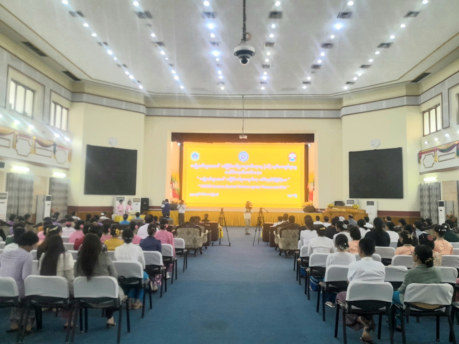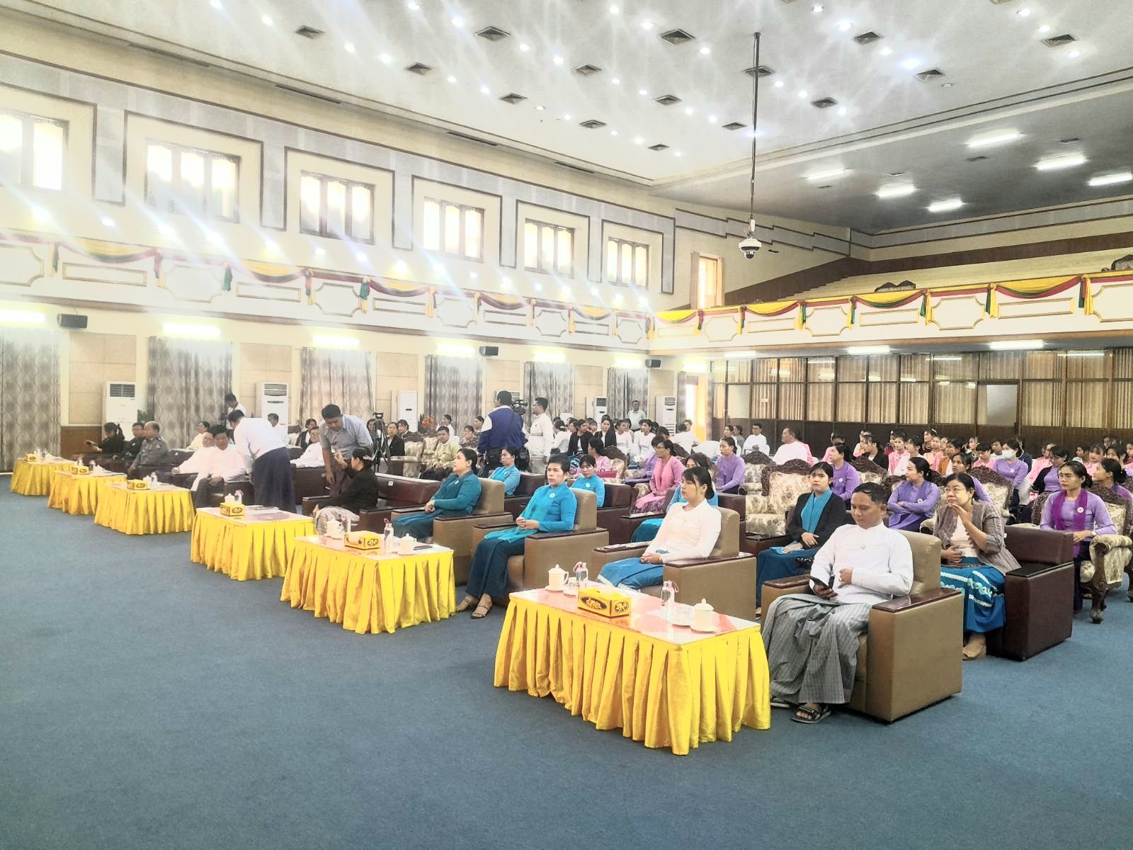 အမျိုးသမီးများအပေါ် အကြမ်းဖက်မှုပပျောက်ရေးနေ့ (၁၆)ရက်တာလှုပ်ရှားမှု အထိမ်းအမှတ် အခမ်းအနားကို ယမန်နေ့နံနက် ၉ နာရီက ချမ်းအေးသာစံမြို့နယ်၊ ပတ်ကုန်းဝန်းကျင်ရပ်ကွက်၊ ၂၆×၂၇ လမ်းကြား၊ ၇၁ လမ်းရှိ မြို့တော်ခန်းမတွင် ကျင်းပပြုလုပ်ခဲ့ရာ မန္တလေးတိုင်းဒေသကြီး တရားလွှတ်တော်၊ တရားသူကြီးချုပ် ဒေါ်ခင်သင်းဝေ၊ တိုင်းဒေသကြီးအမျိုးသမီးကော်မတီဥက္ကဋ္ဌ၊ လူမှုရေးရာဝန်ကြီးဦးအောင်မင်း၊ ဥပဒေချုပ်ဦးမြင့်အောင်၊ မန္တလေးတိုင်းဒေသကြီး ရဲတပ်ဖွဲ့မှူးရုံးမှ ဒုတိယတိုင်းဒေသကြီးရဲတပ်ဖွဲ့မှူး ရဲမှူးကြီးမောင်မောင်အေး၊ တိုင်းဒေသကြီးလူမှုဝန်ထမ်းဦးစီးဌာနမှူး ဦးသက်လှိုင်ထွန်းတို့နှင့် ဌာနဆိုင်ရာတာဝန်ရှိသူများ၊ တိုင်းဒေသကြီး အမျိုးသမီးရေးရာအဖွဲ့နှင့် မိခင်နှင့်ကလေးစောင့်ရှောက်ရေး ကြီးကြပ်မှုကော်မတီဥက္ကဋ္ဌ ဒေါ်မီမီစိုးနှင့်အဖွဲ့ဝင်များ၊ တိုင်းဒေသကြီးအမျိုးသမီးကော်မတီဝင်များ၊ လူမှုဝန်ထမ်းဦးစီးဌာနလက်အောက်ရှိ အမျိုးသမီးသင်တန်းကျောင်းမှ ကျောင်းအုပ်ကြီးများနှင့် သင်တန်းသူများ၊ ဧည့်သည်တော်များ၊ စုစုပေါင်း ၁၅၀ ဦးခန့် တက်ရောက်ခဲ့ကြောင်း သိရသည်။