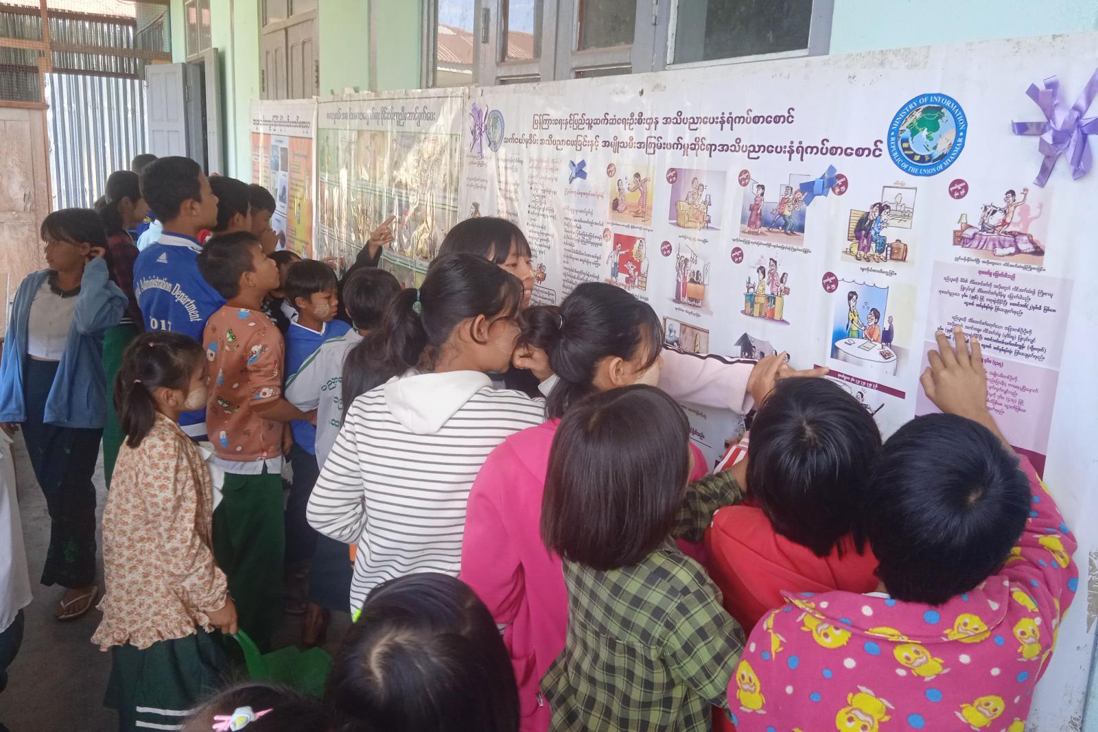 ဆက်လက်၍ ခင်းကျင်းပြသထားသည့် စာအုပ်စာစောင်နှင့် ကလေးသူငယ်အလုပ်သမား ပပျောက်ရေး၊ ကလေးစစ်သား အသုံးမပြုရေး၊ လူကုန်ကူးမှု တားဆီးကာကွယ်ရေး၊ မူးယစ်ဆေးဝါးအန္တရာယ်ဆိုင်ရာ အသိပညာပေး သဘာဝဘေးအန္တရာယ် ကြိုတင်ကာကွယ်ရေး၊ သက်ငယ်မုဒိမ်းမှု ပပျောက်ရေး အသိပညာပေး နံရံကပ်စာစောင်များကို ပြသခဲ့ရာ လူငယ်လူရွယ် ကျောင်းသား၊ ကျောင်းသူများ စိတ်ဝင်စားစွာ လေ့လာကြည့်ရှုခဲ့ကြကြောင်း သိရသည်။