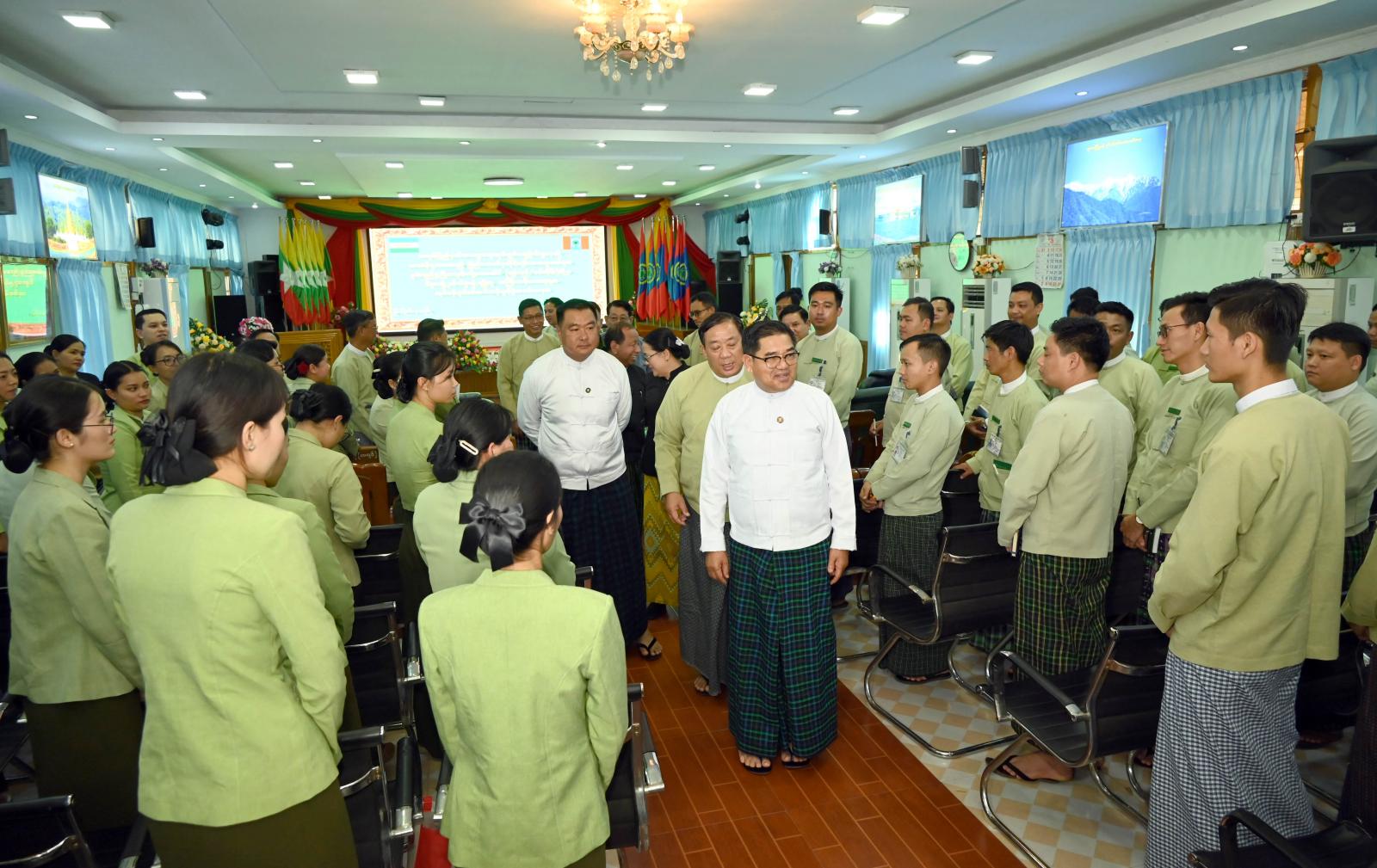 သင်တန်းဖွင့်ပွဲတွင် ပြည်နယ်ဝန်ကြီးချုပ်က ပြည်ထောင်စုတိုင်းရင်းသားလူငယ်များ စွမ်းရည်ဖွံ့ဖြိုးရေးဒီဂရီကောလိပ်ကျောင်းများသည် နယ်စပ် ရေးရာဝန်ကြီးဌာနလက်အောက်တွင် ဖွင့်လှစ်ထားရှိပြီး နယ်စပ်ဒေသတိုင်းရင်းသားလူမျိုးနွယ်စုများ ဖွံ့ဖြိုးတိုးတက်ရေးနှင့် တိုင်းရင်းသား လူငယ်များ စွမ်းရည်ဖွံ့ဖြိုးမြင့်မားရေးအတွက် အကောင်အထည်ဖော်လျက်ရှိသည့်အပြင် ကျောင်းများတွင် ပညာ ရေးကဏ္ဍနှင့်အတူ လေ့ကျင့်ရေးကဏ္ဍတို့ကို စနစ်တကျသင်ကြားပို့ချပြီး နိုင်ငံ့ဝန်ထမ်းကောင်းများ ဖြစ်လာစေရေး လေ့ကျင့်ထားသည့် ကျောင်းဆင်းများဖြစ်သည့် အတွက် ယနေ့ ဝန်ကြီးဌာနအသီးသီးတွင် ဝန်ထမ်းပေါင်း နှစ်သောင်းကျော်ခန့် တာဝန်ထမ်းဆောင်နေပြီ ဖြစ်ပါကြောင်း၊ ယခု တာဝန်ထမ်း ဆောင်ကျမည့်ဝန်ထမ်းများအနေဖြင့် တည်ဆဲဥပဒေများနှင့်အညီ ပြည်သူများ၏ ဆန္နနှင့်လိုအပ်ချက်များကို ကိုယ်ချင်းစာတရားနှင့် အတတ်နိုင်ဆုံး ရိုင်းပင်းကူညီဖြည့်ဆည်းဆောင်ရွက်ပေးကြရန် လိုအပ်ကြောင်း၊ ထို့အပြင် အလုပ်တာဝန်များကို ထမ်းဆောင်သည့် အခါတွင်လည်း တာဝန်ယူတာဝန်ခံစိတ်များထားပြီး တာဝန်ရှိသူ အထက်အကြီးအကဲ၏ လမ်းညွှန်ကွပ်ကဲမှုကို အလေးထားလိုက်နာပြီး ကိုယ်ကျင့်တရားကောင်းမွန်ရေး၊ အဂတိတရားကင်းရှင်းရေးကို ရှေးရှုကာ စေတနာရင်းခံဖြင့် ဝန်ဆောင်မှုပေးကြရန်လိုကြောင်း တိုက်တွန်း မှာကြားသည်။