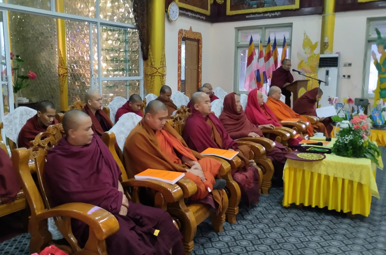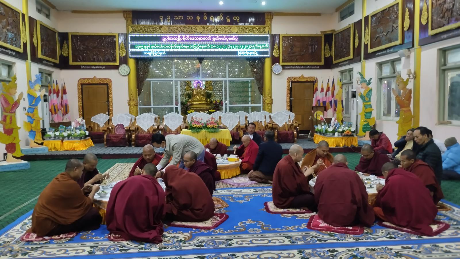 ရှေးဦးစွာ နိုင်ငံတော်သံဃမဟာနာယကအဖွဲ့ဝင် မြစ်ကြီးနားမြို့ ခေမာသီဝင်ကျောင်းတိုက် ဆရာတော် အဂ္ဂမဟာပဏ္ဍိတ ဘဒ္ဒန္တစန္ဒာဝရာဘိဝံသ အမှူးပြုသော ဆရာတော်သံဃာတော် အရှင်သူမြတ်များအား ကချင်ပြည်နယ်အစိုးရအဖွဲ့ဝင် တိုင်းရင်းသားရေးရာဝန်ကြီး ဦးကျော်မင်းခိုင် နှင့်ဇနီး၊ ဌာနဆိုင်ရာများ၊ မြို့နယ်ဗုဒ္ဓဘာသာသာသနာရေးရာအဖွဲ့ဝင်များ၊ ဂေါပကအဖွဲ့ဝင်များက လှူဖွယ်ဝတ္ထုပစ္စည်းများ လှူဒါန်းပြီး၊ အရုဏ်ဆွမ်းဆက်ကပ်သည်။ ထို့နောက် ဆရာတော်သံဃာတော်များက ဥပ္ပါတသန္တိပါဠိဒေသနာတော်ကို ရွတ်ဖတ်ပူဇော်ကြသည်။