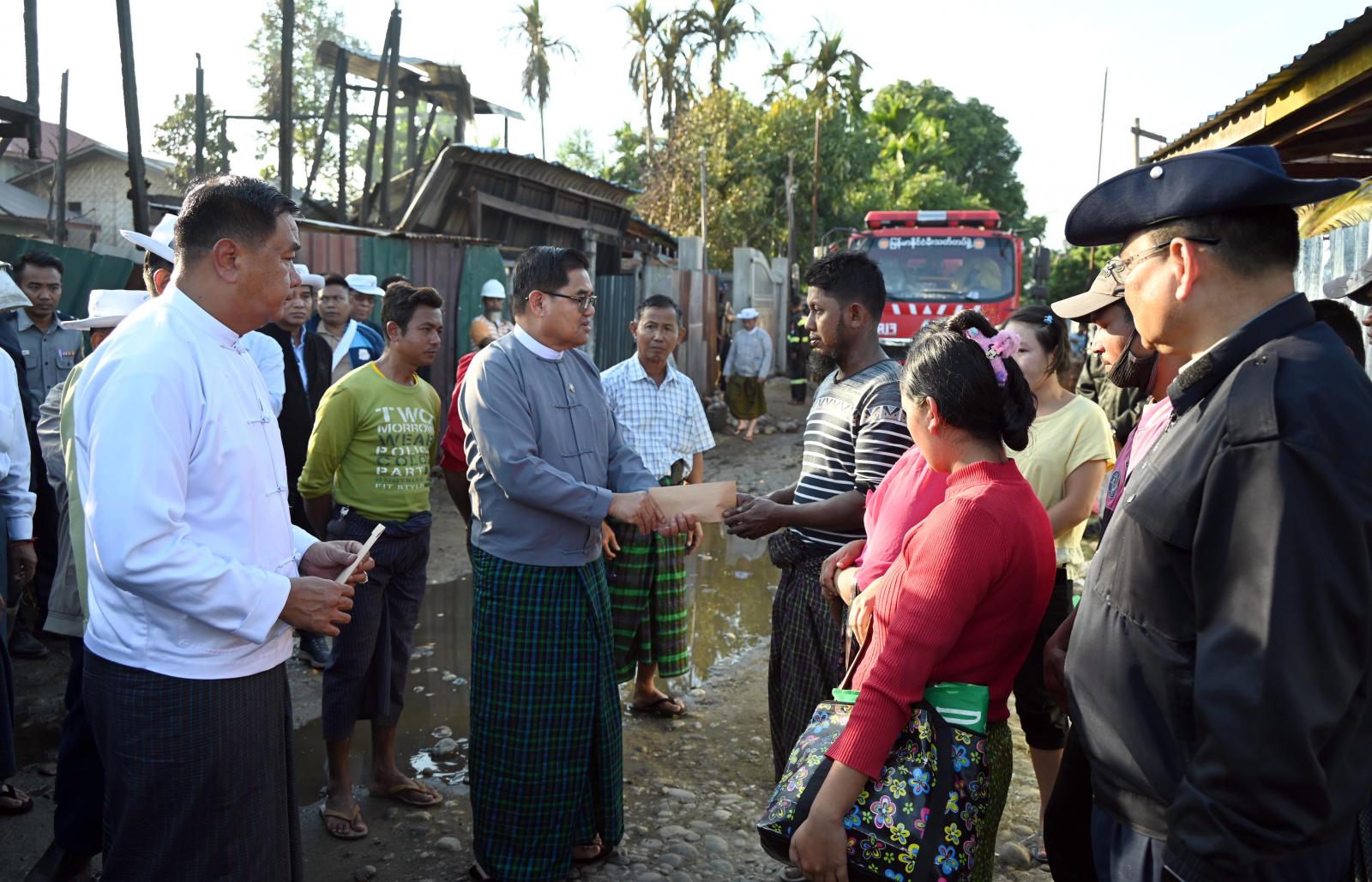 ထိုမှတစ်ဆင့် ပြည်နယ်ဝန်ကြီးချုပ်နှင့် အဖွဲ့ဝင်များသည် ရမ်ပူရပ်ကွက် နယ်မြေ ၁၁၊ လမ်းသွယ် ၃၄ အတွင်း မွန်းလွဲ ၁ နာရီခွဲက မီးလောင်မှုဖြစ်စဉ်ကြောင့် လူနေအိမ် ၄ လုံး မီးလောင် ဆုံးရှုံးခဲ့ရသဖြင့် အဆိုပါ မီးလောင်ရာနေရာသို့ သွားရောက်ကာ မီးလောင်မှုဖြစ်စဉ်ကြောင့် ဆုံးရှုံးခဲ့သည့် လူနေအိမ်များအား လှည့်လည်ကြည့်ရှုစစ်ဆေးပြီး နေအိမ်ဆုံးရှုံးခဲ့သည့် မိသားစုဝင်များအား ရင်းနှီးနွေးထွေးစွာ အားပေးစကား ပြောကြားသည်။ ဆက်လက်၍ ပြည်နယ်ဝန်ကြီးချုပ်က မီးဘေးသင့်အိမ်ထောင်စု (၄)စုအတွက် ထောက်ပံ့ငွေကျပ် ၁၀ သိန်းနှင့် မီးသတ် တပ်ဖွဲ့ဝင်များအတွက် ထောက်ပံ့ငွေကျပ် နှစ်သိန်းကို ထောက်ပံ့ပေးအပ်ခဲ့ပြီး မီးလောင်ရာနေရာအား အမြန်ဆုံးရှင်းလင်း နိုင်ရေး၊ လတ်တလော နေထိုင်စားသောက်မှု အဆင်ပြေစေရေးနှင့် ဌာနဆိုင်ရာများနှင့် အမြန်ဆုံး ဆက်သွယ်အကူအညီပေးနိုင်ရေး တာဝန်ရှိသူများနှင့် ညှိနှိုင်းပေါင်းစပ် ဆောင်ရွက်ပေးခဲ့သည်။