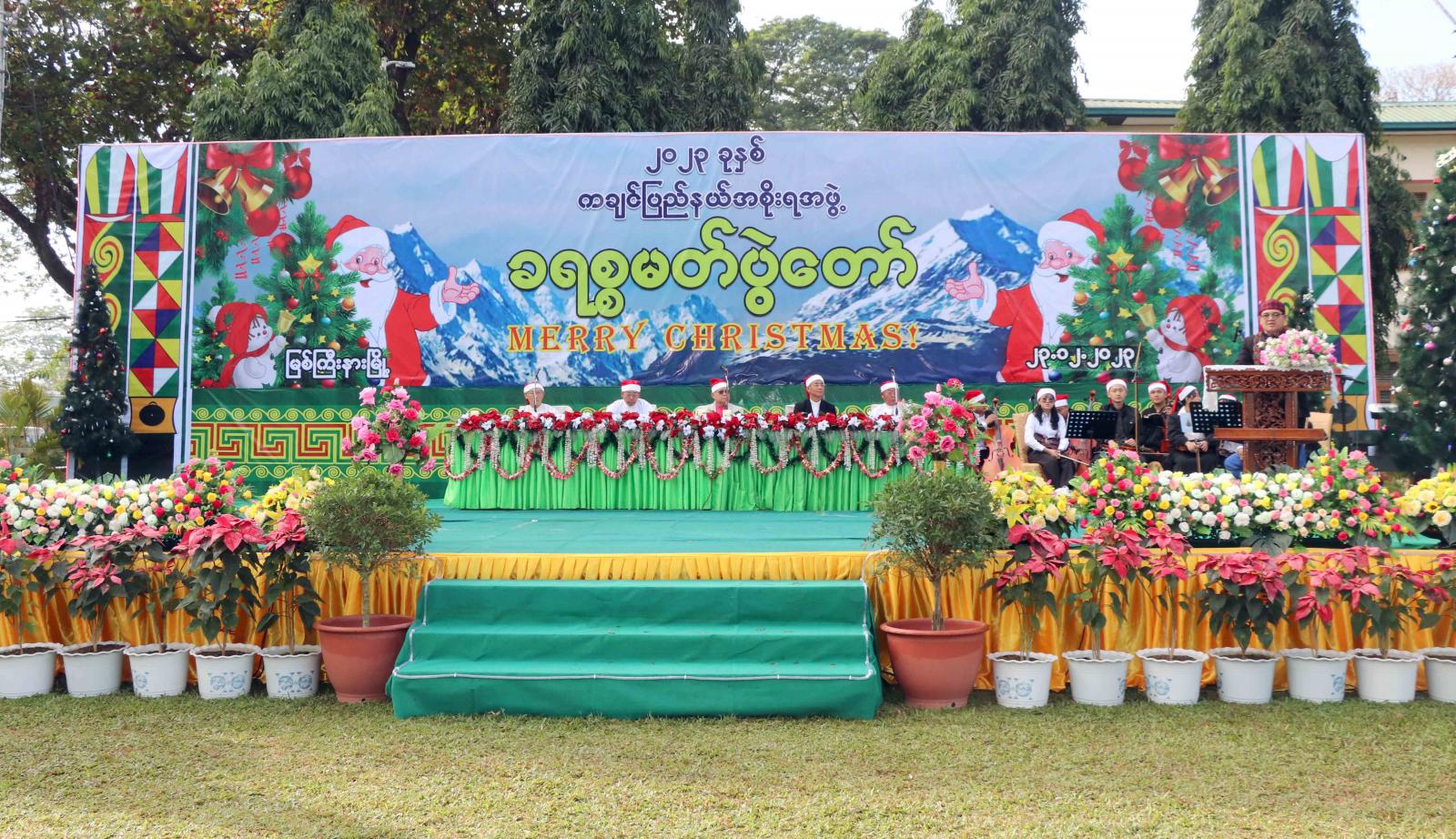 ကချင်ပြည်နယ်အစိုးရအဖွဲ့မှ ကြီးမှူးကျင်းပသည့် ၂၀၂၃ ခုနှစ် ပြည်နယ်အစိုးရအဖွဲ့၏ မိသားစု ခရစ္စမတ်ဝတ်ပြုဆုတောင်းပွဲတော်အခမ်းအနားကို ယနေ့နံနက် ၉ နာရီက ပြည်နယ်အစိုးရအဖွဲ့ရုံးရှေ့ မြက်ခင်းပြင်၌ ကျင်းပပြုလုပ်သည်။