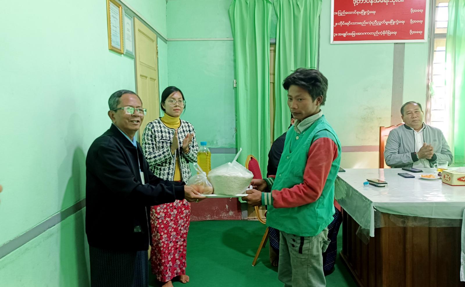 ထိုသို့ ထောက်ပံ့ပေးအပ်ရာတွင် ရုံးဝန်ထမ်း (၃၉) ဦးအတွက်ဆီနှင့် ကြက်ဥကိုလည်းကောင်း၊ အောက်ခြေဝန်ထမ်းများဖြစ်ကြသည့် စိမ်းလန်းစိုပြေရေးလုပ်သား၊ ဈေးညစောင့်လုပ်သားနှင့် သန့်ရှင်းရေးလုပ်သား စုစုပေါင်း (၃၆) ဦးအတွက်ဆန်၊ ဆီနှင့်ကြက်ဥစသည်တို့ကို ခရိုင်စီမံအုပ်ချုပ်ရေးအဖွဲ့ဥက္ကဋ္ဌနှင့် တာဝန်ရှိသူများက အသီးသီးထောက်ပံ့ပေးအပ်ခဲ့ကြကြောင်း သိရသည်။