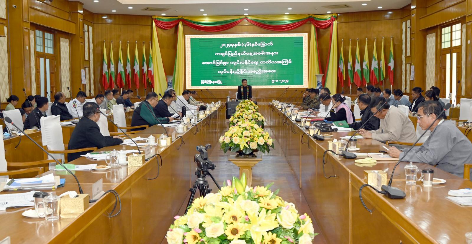 ထို့နောက် မြောက်ပိုင်းတိုင်းစစ်ဌာနချုပ် ဒုတိယတိုင်းမှူး ဗိုလ်မှူးကြီးရာဇာထွန်းနှင့် တပ်မတော်အရာရှိကြီးက တပ်မတော်မှ ပူးပေါင်းပါဝင်ဆောင်ရွက်သွားမည့် အစီအစဉ်များနှင့် ညှိနှိုင်းပေါင်းစပ်ဆောင်ရွက်ပေးသွားမည့် အစီအစဉ်များကို ရှင်းလင်းတင်ပြကြပြီး ပြည်နယ်ဝန်ကြီးများနှင့် ဆပ်ကော်မတီအသီးသီးမှ တာဝန်ရှိသူများက ပြည်နယ်နေ့ အထိမ်းအမှတ် သဝဏ်လွှာဖတ်ပွဲ၊ ဂုဏ်ထူးဆောင်လက်မှတ်၊ ဆုတံဆိပ်နှင့်ဆုပစ္စည်းများ ပေးအပ်ချီးမြှင့်ပွဲ၊ ဌာနဆိုင်ရာပြခန်းများနှင့် MSME ထုတ်ကုန်ပစ္စည်းပြခန်း၊ တိုင်းရင်းသားရိုးရာယဉ်ကျေးမှုပြခန်း စသည့်ပြခန်း(၁၆)ခန်းဖွင့်လှစ် ပြသသွားမည့် အစီအစဉ်များ၊ မီနီမာရသွန်အပါအဝင် အားကစားနည်း(၁၆)မျိုး ထည့်သွင်းကျင်းပသွားမည့် အစီအစဉ်များနှင့် စပ်လျဉ်း၍ ဘဏ္ဍာငွေလိုအပ်ချက်၊ ကြိုတင်ပြင်ဆင်ဆောင်ရွက်ထားရှိမှု အခြေအနေများနှင့် ညှိနှိုင်းပေါင်းစပ်ဆောင်ရွက်ပေးရမည့် ကိစ္စရပ်များကို တင်ပြဆွေးနွေးခဲ့ကြသည်။