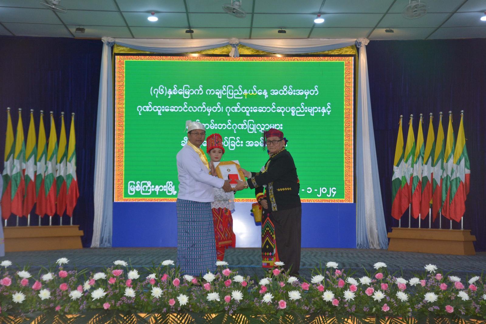 ယင်းနောက် ပြည်နယ်ဝန်ကြီးချုပ်၏ ဇနီးဒေါ်နန်ဆိုင်း၊ ပြည်နယ်အစိုးရအဖွဲ့ဝင် ဝန်ကြီးများနှင့် ၎င်းတို့၏ ဇနီးများက လူမှုရေးဆိုင်ရာထူးချွန်ဆု (ဒုတိယအဆင့်) ဆုရရှိသူ (၁၆)ဦးနှင့် အဆင့်မြင့်ပညာနှင့် အခြေခံပညာကျောင်းများမှ စာစီစာကုံးပြိုင်ပွဲ၊ ကဗျာပြိုင်ပွဲဆုရရှိသူများ၊ စီမံခန့်ရေး ဆိုင်ရာ ထူးချွန်ဆု (တတိယအဆင့်) ဆုရသူ (၇)ဦးတို့ကို ဂုဏ်ထူးဆောင်လက်မှတ်၊ ဂုဏ်ထူးဆောင်ဆုပစ္စည်းနှင့် ဂုဏ်ပြုမှတ်တမ်းလွှာများကို အသီးသီးပေးအပ်ချီးမြှင့်ခဲ့ကြသည်။