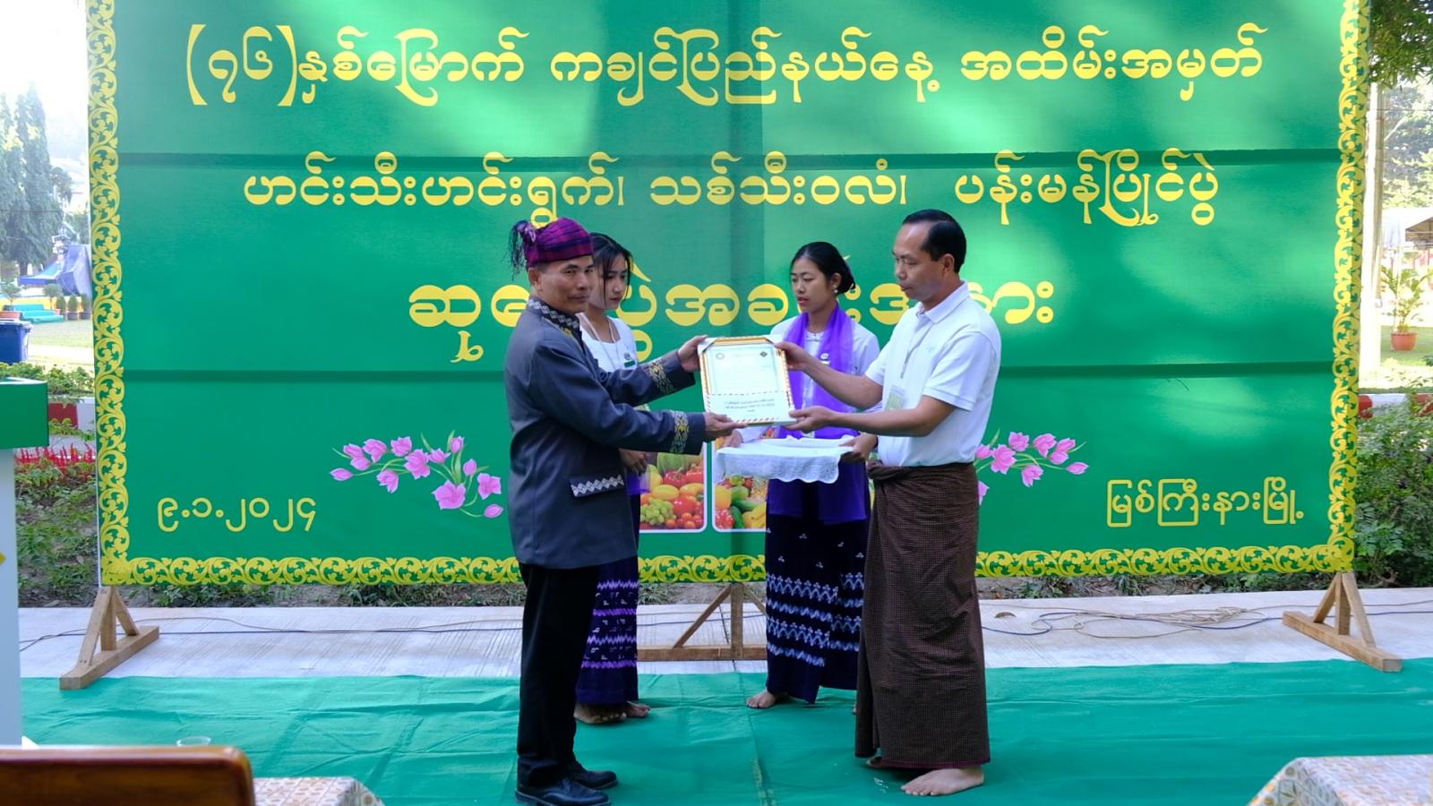 ဆက်လက်၍ ပြည်ထောင်စုဝန်ကြီး၊ ပြည်နယ်တရားသူကြီးချုပ်၊ ပြည်နယ်အစိုးရအဖွဲ့ဝင် လူမှုရေးရာဝန်ကြီးနှင့် ပြည်နယ်ဦးစီးမှူးများက သီးနှံ/ပန်းမန် အမျိုးအစားအလိုက် ပြိုင်ပွဲတွင် ဆုရရှိသည့် တောင်သူပုဂ္ဂလိကလုပ်ငန်းရှင်များကို ဂုဏ်ပြုဆုများ အသီးသီး ချီးမြှင့်ပေးအပ်ခဲ့ကြကြောင်း သတင်းရရှိသည်။