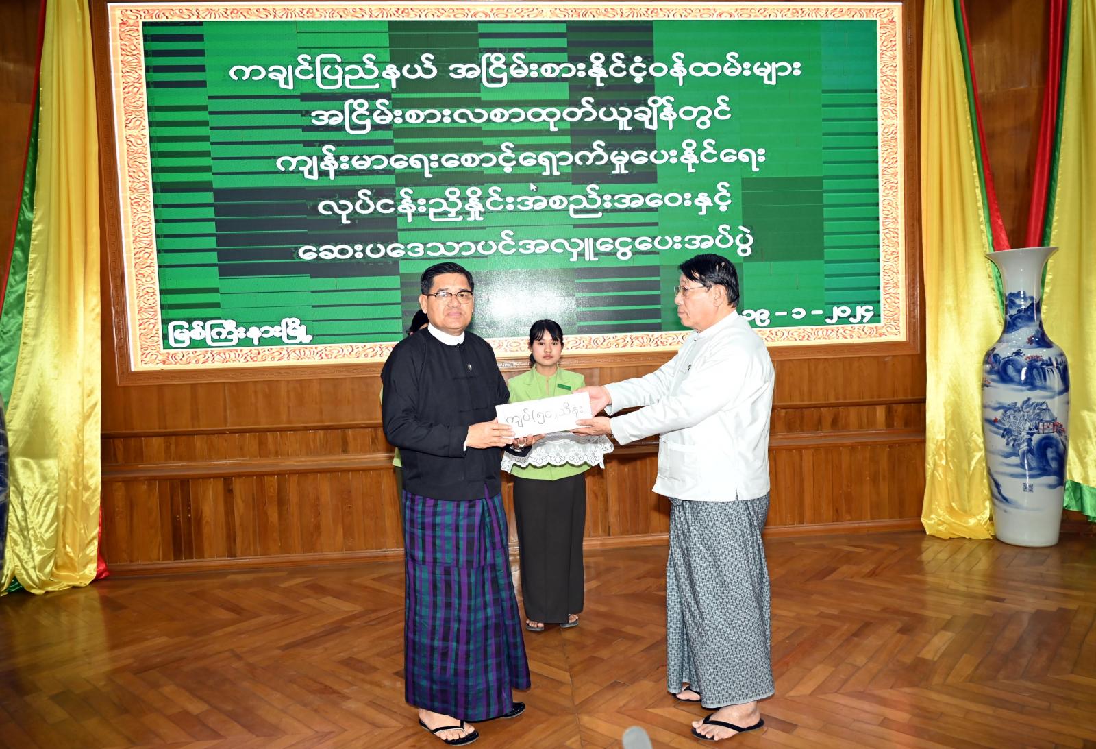 ယင်းနောက် အငြိမ်းစားနိုင်ငံ့ဝန်ထမ်းများအား ကျန်းမာရေးစောင့်ရှောက်မှုလုပ်ငန်းအစီအစဉ် အတွက် ဆေးပဒေသာပင်ရန်ပုံငွေအဖြစ် ပြည်နယ်အစိုးရအဖွဲ့မှ ငွေကျပ်သိန်း (၅၀)၊ ပြည်နယ် ဝန်ကြီးချုပ်၊ ပြည်နယ်တရားလွှတ်တော်တရားသူကြီးချုပ်၊ ပြည်နယ်ဝန်ကြီးများ၊ ပြည်နယ်ဥပဒေချုပ် နှင့် ပြည်နယ်အဆင့်ဌာနဆိုင်ရာများက စုစုပေါင်းငွေကျပ် (၁၁၇)သိန်းကို မတည်လှူဒါန်းပေးအပ် ခဲ့ကြရာ ပြည်နယ်ဝန်ကြီးချုပ်နှင့် ပြည်နယ်စီးပွားရေးရာဝန်ကြီးတို့က လက်ခံရယူခဲ့ကြသည်။