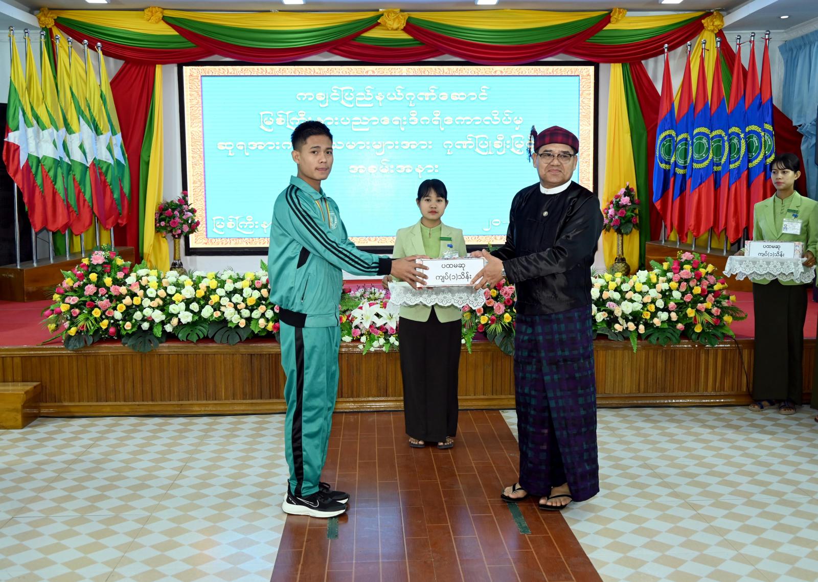 ထို့နောက် ပညာရေးဒီဂရီကောလိပ်ပေါင်းစုံအားကစားပြိုင်ပွဲ ဗဟိုအဆင့်ပြိုင်ပွဲများတွင် ဆုရ သူများအား ဂုဏ်ပြုချီးမြှင့်ရာ ပြည်နယ်ဝန်ကြီးချုပ်က မီတာ ၄၀၀ (အမျိုးသား)အပြေးပြိုင်ပွဲတွင် ရွှေတံဆိပ်ဆုရ အားကစားသမားနှင့် မန္တလေးဇုန်ဘောလုံး(က)အသင်းမှ ရွှေတံဆိပ်ဆုရ အားကစား သမား (၂)ဦးတို့အား လည်းကောင်း၊ ပြည်နယ်ဝန်ကြီးချုပ်၏ဇနီး ဒေါ်နန်ဆိုင်းက မီတာ(၄၀၀) အမျိုး သမီးအပြေးပြိုင်ပွဲတွင် ရွှေတံဆိပ်ဆုရအားကစားသမားအား လည်းကောင်း၊ ပြည်နယ်ဝန်ကြီးများက မန္တလေးဇုန်ဘောလုံး(ခ)အသင်းမှ ငွေတံဆိပ်ဆုရသူ (၄)ဦး၊ အလျားခုန်(အမျိုးသား)ပြိုင်ပွဲနှင့် မီတာ ၁၀၀ အပြေးပြိုင်ပွဲများတွင် ကြေးတံဆိပ်ဆုရသူ (၂)ဦးတို့အား ဂုဏ်ပြုချီးမြှင့်ငွေများကို အသီးသီး ပေးအပ်ချီးမြှင့်ခဲ့ကြရာ အောင်ပွဲရအားကစားသမားများကိုယ်စား ရွှေတံဆိပ်ဆုရသူတစ်ဦးက ကျေးဇူး တင်စကားပြန်လည်ပြောကြားခဲ့ကြောင်း သိရသည်။