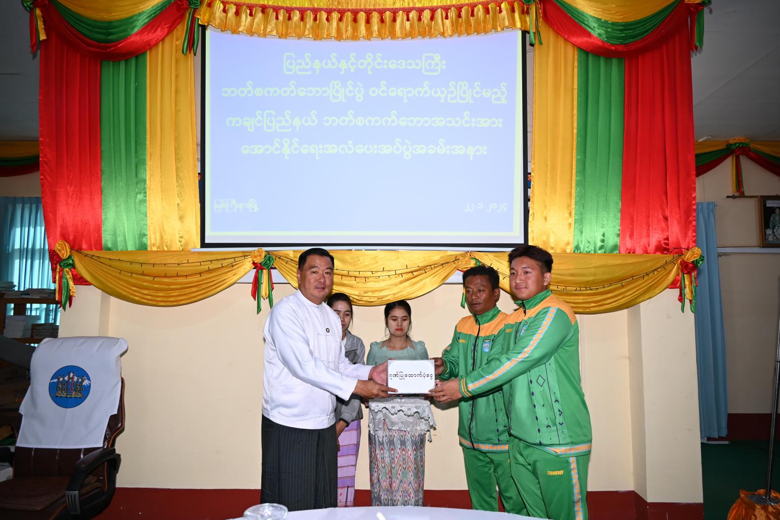 ထို့နောက် ပြည်နယ်ဝန်ကြီးက ပြည်နယ်လက်ရွေးစင်အသင်းအတွက် အောင်နိုင်ရေးအလံနှင့် ထောက်ပံ့ငွေကျပ်သိန်း (၃၀)ကို အသင်း အုပ်ချုပ်သူ၊ နည်းပြနှင့် အသင်းသားထံ ထောက်ပံ့ပေးအပ်ရာ အသင်းနည်းပြက လက်ရွေးစင် စုဖွဲ့လေ့ကျင့်ဆောင်ရွက်ထားရှိမှု အခြေအနေ များနှင့် ပြိုင်ပွဲဝင်ရောက်ယှဉ်ပြိုင်သွားမည့် အခြေအနေများကို ရှင်းလင်းတင်ပြခဲ့ကြောင်း သိရသည်။