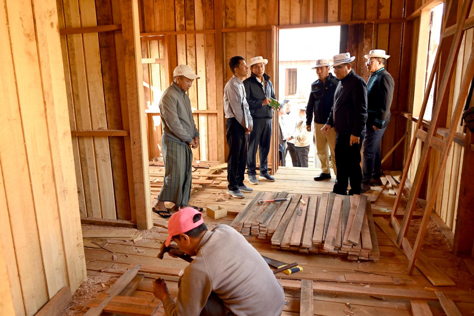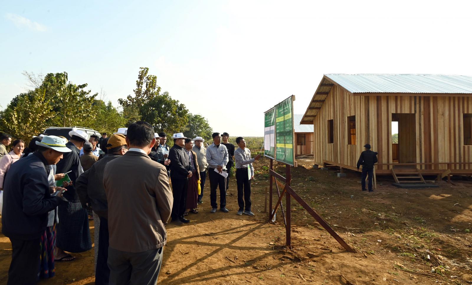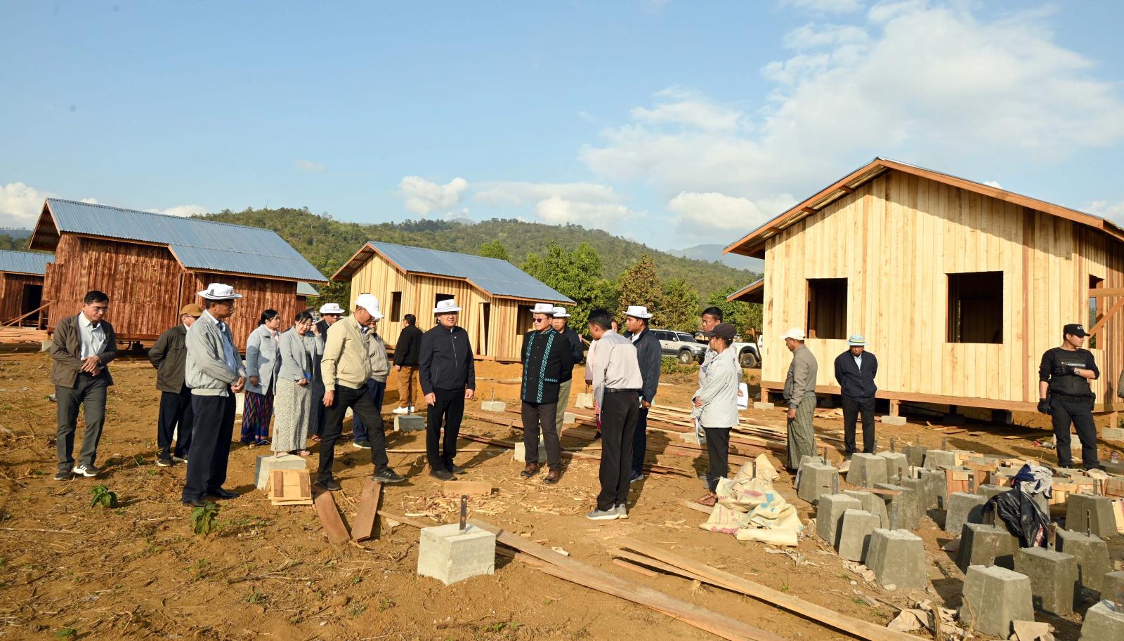 ထို့နောက် အဆိုပါကျေးရွာအတွင်း ၂၀၁၂-၂၀၁၃ ဘဏ္ဍာရေးနှစ်မှ စတင်တည်ဆောက်ခဲ့သည့် တန်ဖိုးနည်းအိမ်ရာ ၅၀၀ ကျော်ရှိသည့်အနက် ပြန်လည်နေရာချထားပေးသည့် အိမ်ထောင်စုများမှ တိုးတက်လာသော လူဦးရေနှင့် မြို့နယ်အတွင်းရှိ ယာယီခိုလှုံရာစခန်းများမှ မိသားစုများ ထပ်မံနေရာချထားပေးနိုင်ရေး ၂၀၂၃ -၂၀၂၄ ဘဏ္ဍာရေးနှစ် ပြည်နယ်ဘဏ္ဍာရန်ပုံငွေဖြင့် ကျေးလက်ဒေသဖွံ့ဖြိုး တိုးတက်ရေးဦးစီးဌာနက တာဝန်ယူဆောင်ရွက်လျက်ရှိသည့် (၂၄ ပေ × ၁၈ ပေ)ရှိ ပျဉ်ခင်း၊ ပျဉ်ကာ သွပ်မိုး တန်ဖိုးနည်းနေအိမ်သစ် ၂၅ လုံးတည်ဆောက်နေမှုကိုလည်းကောင်း၊ နယ်စပ်ရေးရာဝန်ကြီးဌာန၊ နယ်စပ်ဒေသနှင့်တိုင်းရင်းသားလူမျိုးများ ဖွံ့ဖြိုးတိုးတက်ရေးဦးစီးဌာနက ပြည်နယ်အစိုးရအဖွဲ့ရန်ပုံငွေဖြင့် ပြည်တွင်းနေစွန့်ခွာသူများအတွက် တိုးချဲ့တည်ဆောက်လျက်ရှိသည့် နေအိမ် ၁၀၂ လုံး တည်ဆောက်နေမှုအခြေအနေများကို ကွင်းဆင်းစစ်ဆေးခဲ့ကြပြီး တည်ဆောက်ရေးလုပ်ငန်းများကို သတ်မှတ်ချိန်အမီ ပြီးစီးအောင် ဆောင်ရွက်ရေး၊ ရွှေ့ပြောင်းနေထိုင်လိုသူ မိသားစုများအား အမြန်ဆုံးနေရာချထားပေးနိုင်ရေး တာဝန်ရှိသူများနှင့် ပေါင်းစပ်ညှိနှိုင်းဆောင်ရွက်ပေးခဲ့သည်။