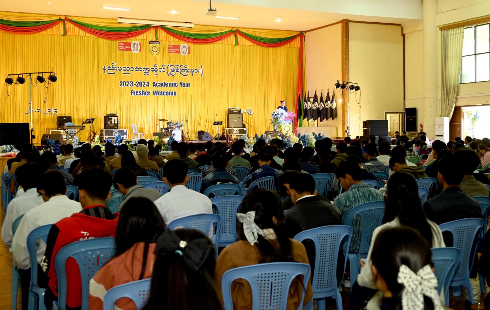 ထို့နောက် ပထမနှစ်ကျောင်းသား/ ကျောင်းသူ မောင်မယ်သစ်လွင်ကြိုဆိုပွဲကို ဘွဲ့နှင်းသဘင် ခန်းမ၌ ဆက်လက်ကျင်းပရာ ပြည်နယ်ဝန်ကြီးချုပ်က ယနေ့ Project Show သည် ကျောင်းသား/ ကျောင်းသူများကိုယ်တိုင် ပြုလုပ်ထားသည့် Project ဖြစ်သည့်အတွက် စိတ်ဝင်စားစရာကောင်းသည်ကို တွေ့ရှိရပါကြောင်း၊ ကျောင်းသား/ကျောင်းသူများ၏ တီထွင်မှုစွမ်းရည်များ တိုးတက်လာခြင်း၊ ဌာနများနှင့် ပူးပေါင်းဆောင်ရွက်တတ်လာခြင်း၊ Junior ကျောင်းသား/ ကျောင်းသူများကိုလည်း လေ့လာဆန်းစစ်နိုင်သကဲ့သို့ သုတေသနများ ဆက်လက်ပြုလုပ်နိုင်ရန် တွန်းအားတစ်ခုဖြစ်စေမည် ဖြစ်ပါကြောင်း၊ ယခုပထမနှစ်တက်ရောက်လာကြသည့် မောင်/မယ်များကို စီနီယာအစ်ကိုကြီး/ အစ်မကြီးများက နွေးထွေးစွာကြိုဆိုခြင်းဖြစ်ပြီး မောင်မယ်သစ်လွင်များအနေဖြင့် စိန်ခေါ်မှု၊ ခက်ခဲမှုများကို ပညာသင်ကာလအတွင်း ဖြတ်သန်းကြရမည်ဖြစ်သည့်အတွက် ကံ၊ ဉာဏ်၊ ဝီရိယ၊ ဇွဲတို့ အထူးလိုအပ်ကြောင်းကို မှာကြားလိုပါကြောင်း၊ နိုင်ငံအကျိုးပြု အင်ဂျင်နီယာကောင်းများဖြစ်လာစေရေး၊ ပတ်ဝန်းကျင်ကောင်းဖန်တီးပေးနိုင်ပြီး ဗလငါးတန်ဖြင့် ပြည့်စုံသည့် လူငယ်များဖြစ်လာစေရေး ကြိုးစားကြရန်လိုကြောင်း တိုက်တွန်းမှာကြားသည်။