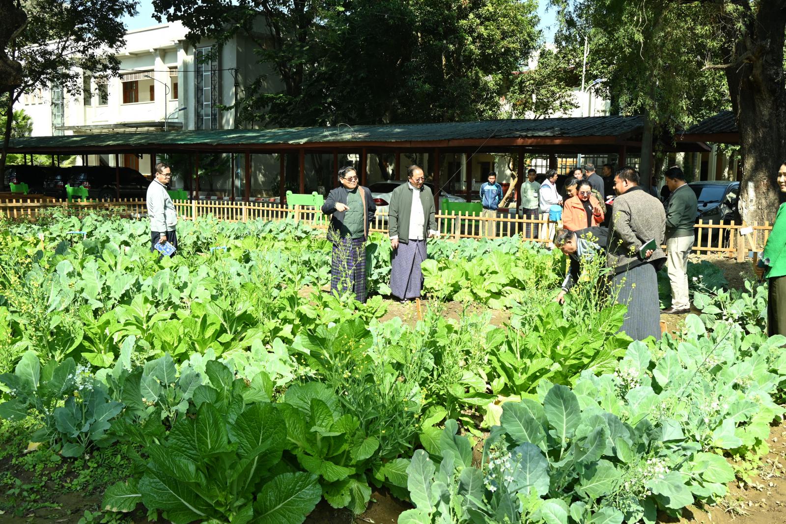ရှေးဦးစွာ ပြည်နယ်ဝန်ကြီးချုပ်နှင့် အဖွဲ့ဝင်များသည် ပြည်နယ်အစိုးရအဖွဲ့ရုံးဝင်းအတွင်း ဝန်ထမ်းများနှင့် ရုံးသို့လာရောက်သူများ အနားယူနိုင်ရေး ဆောင်ရွက်ပေးထားသည့် Stone Garden ပန်းခြံငယ်အတွင်း မြေယာရှုခင်းများပြုပြင်၍ အလှပန်းပင်များ တိုးချဲ့စိုက်ပျိုးဆောင်ရွက်ထားရှိမှု အခြေအနေများနှင့် ရုံးပင်မအဆောက်အဦ အနောက်ဘက်မြေကွက်လပ်တွင် ပြည်နယ်အစိုးရအဖွဲ့ ဝန်ကြီးဌာနအလိုက် ရုံးအဖွဲ့များ၊ ဌာနခွဲ/ဌာနစုအသီးသီးမှ ဝန်ထမ်းများ တစ်ပိုင်တစ်နိုင် စိုက်ပျိုးထားသည့် မုန်ညှင်း၊ ကိုက်လံ၊ ခရမ်းချဉ်သီး၊ ငရုတ်သီးစသည့် ဟင်းသီးဟင်းရွက်စိုက်ခင်းအား လှည့်လည်ကြည့်ရှုစစ်ဆေးခဲ့ကြပြီး ပြည်နယ်ဝန်ကြီးချုပ်က ရုံးသန့်ရှင်းသာယာပြီး သစ်ပင်ပန်းမံများဖြင့် စိမ်းလန်းစိုပြည်နေစေရေးအတွက် အလေးထားဆောင်ရွက်ကြရေး တိုက်တွန်းမှာကြားခဲ့သည်။