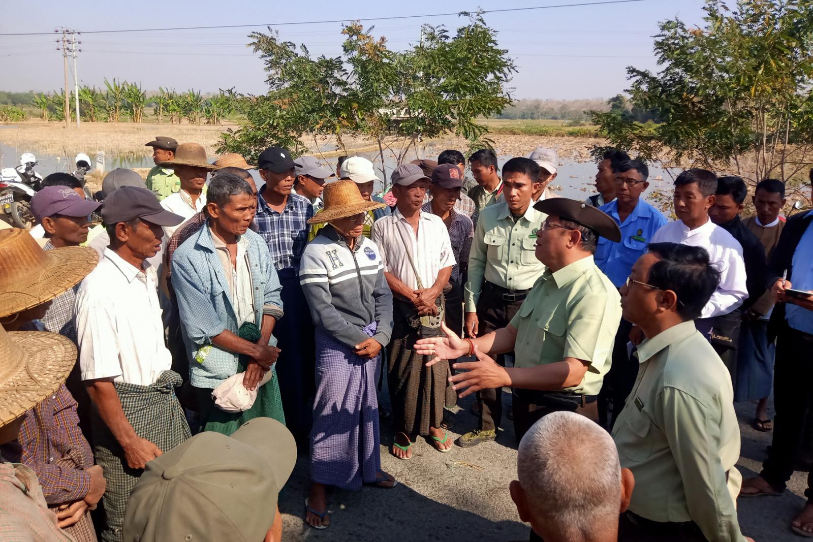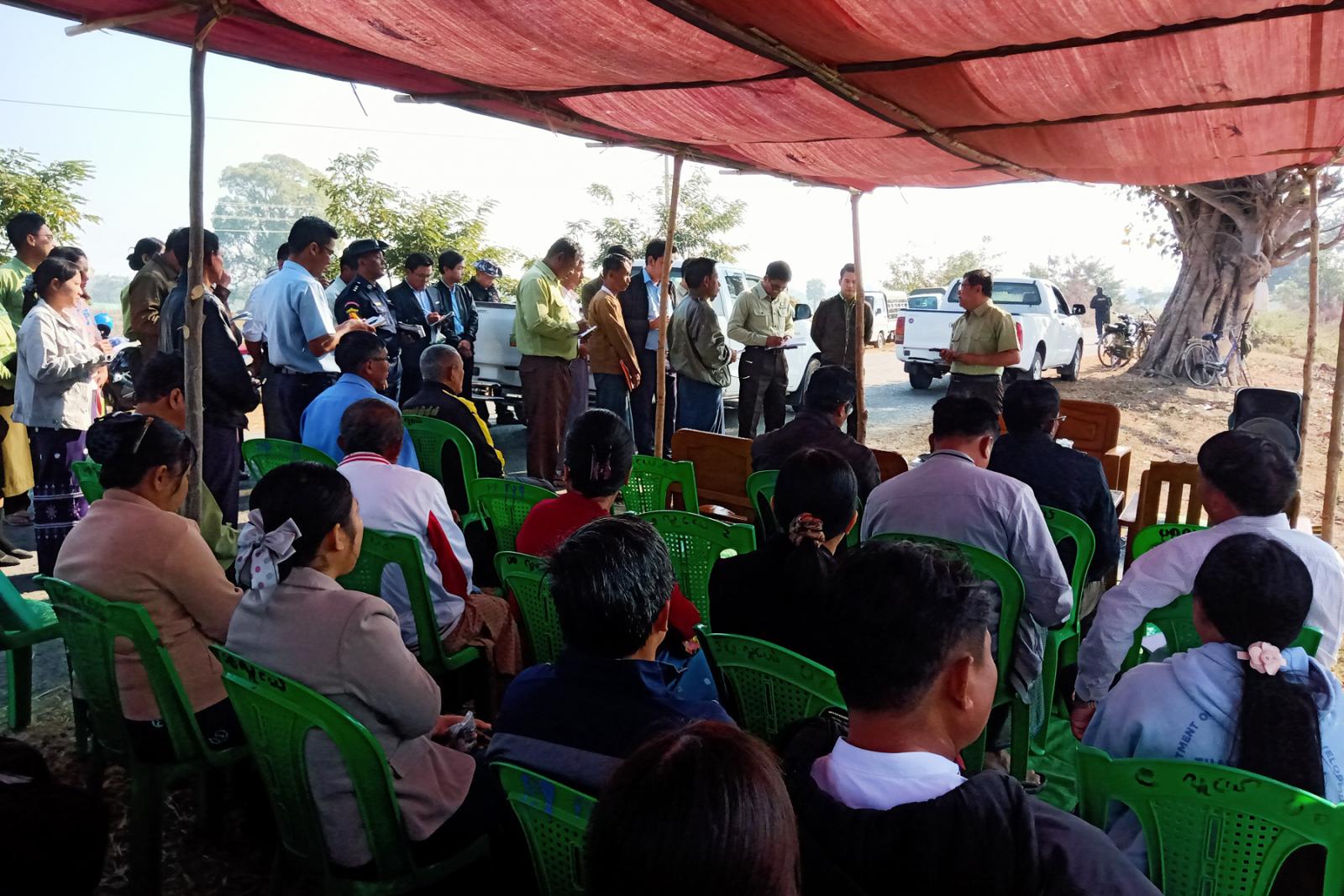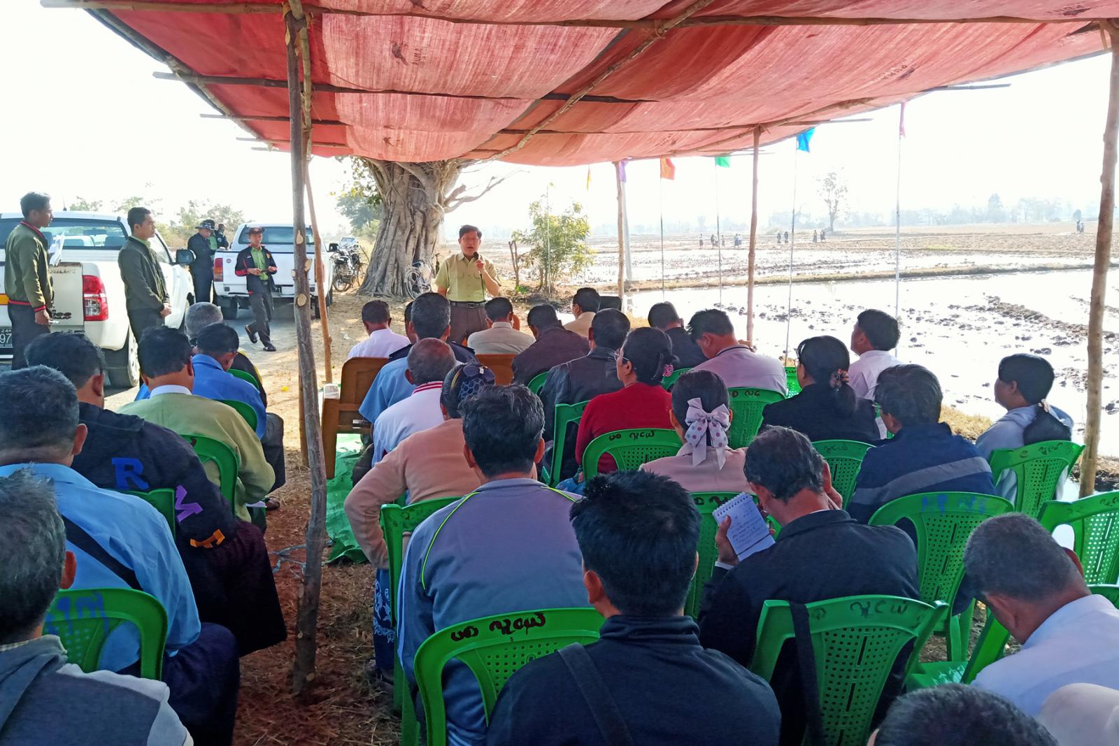 ဆက်လက်၍ ခရိုင်စီမံအုပ်ချုပ်ရေးအဖွဲ့ဥက္ကဋ္ဌ ခရိုင်အုပ်ချုပ်ရေးမှူးနှင့်အဖွဲ့ဝင်များက တောင်သူများ၏ စုပေါင်းလယ်ကြားမြောင်း ဖောက်လုပ်နေမှုအား ကြည့်ရှုအားပေးခဲ့သည်။ ထို့နောက် နွေစပါးစိုက်ပျိုးမည့် ကျေးရွာအုပ်စု (၁၃) အုပ်စုမှ ကျေးရွာအုပ်စုလုပ်ငန်းအဖွဲ့ (Task Force) အဖွဲ့ခေါင်းဆောင်များ ကျေးရွာအုပ်စု အုပ်ချုပ်ရေးမှူးများအား ခရိုင်စီမံအုပ်ချုပ်ရေးအဖွဲ့ဥက္ကဋ္ဌ ခရိုင်အုပ်ချုပ်ရေးမှူးက လိုအပ်သည်များ ဖြည့်စွက်မှာကြားခဲ့ပြီး နွေစပါးစိုက်ပျိုးမည့် တောင်သူများအား အားပေးစကားများ ပြောကြားခဲ့ကြောင်း သိရသည်။