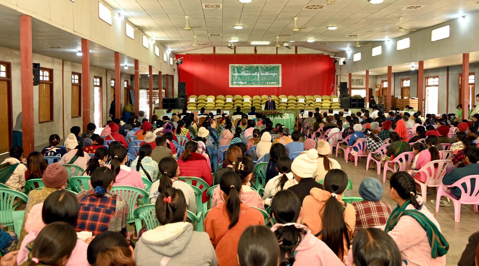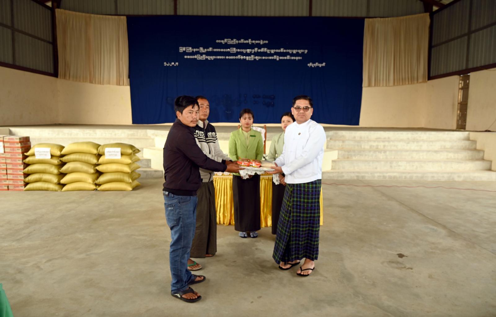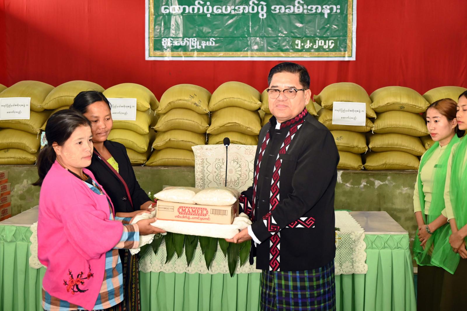 ဆက်လက်၍ ပြည်နယ်ဝန်ကြီးချုပ်၊ ပြည်နယ်တရားလွှတ်တော်တရားသူကြီးချုပ်၊ ပြည်နယ်ဝန်ကြီးများက အိမ်ထောင်စု (၇၀)စု၊ လူဦးရေ ၂၉၆ ဦးတို့အတွက် ကချင်ပြည်နယ်အစိုးရအဖွဲ့က ထောက်ပံ့သည့် ဆန် (၆) ပြည်ပါ အိတ် (၇၀)အိတ်၊ ခေါက်ဆွဲခြောက်ဖာ (၇၀)နှင့် ပြည်နယ်ဘေးအန္တရာယ်ဆိုင်ရာ စီမံခန့်ခွဲမှုဦးစီးဌာနက လူဦးရေ (၂၉၆)ဦးတို့အတွက် ဆန်ရိက္ခာ (၁)လစာအတွက် ထောက်ပံ့ငွေကျပ် (၂၆၆၄၀၀၀)တို့ဖြင့် ဆန်ရိက္ခာနှင့် ငွေသား စုစုပေါင်း ၅၂၁၉၀၀၀ ကို အသီးသီး ထောက်ပံ့ပေးအပ်ခဲ့ကြရာ တိမ်းရှောင်မိသားစုများကိုယ်စား သိက္ခာတော်ရ ဆရာဆာမူခီက ကျေးဇူးတင်စကား ပြန်လည်ပြောကြားပြီး ဆုတောင်းဆက်ကပ်ပေးခဲ့ရာ ပြည်နယ်ဝန်ကြီးချုပ်က နိဂုံးချုပ်အမှာစကားပြောကြားကာ အိမ်ထောင်စုများအား ရင်းရင်းနှီးနှီး လိုက်လံနှုတ်ဆက် အားပေးခဲ့ကြသည်။