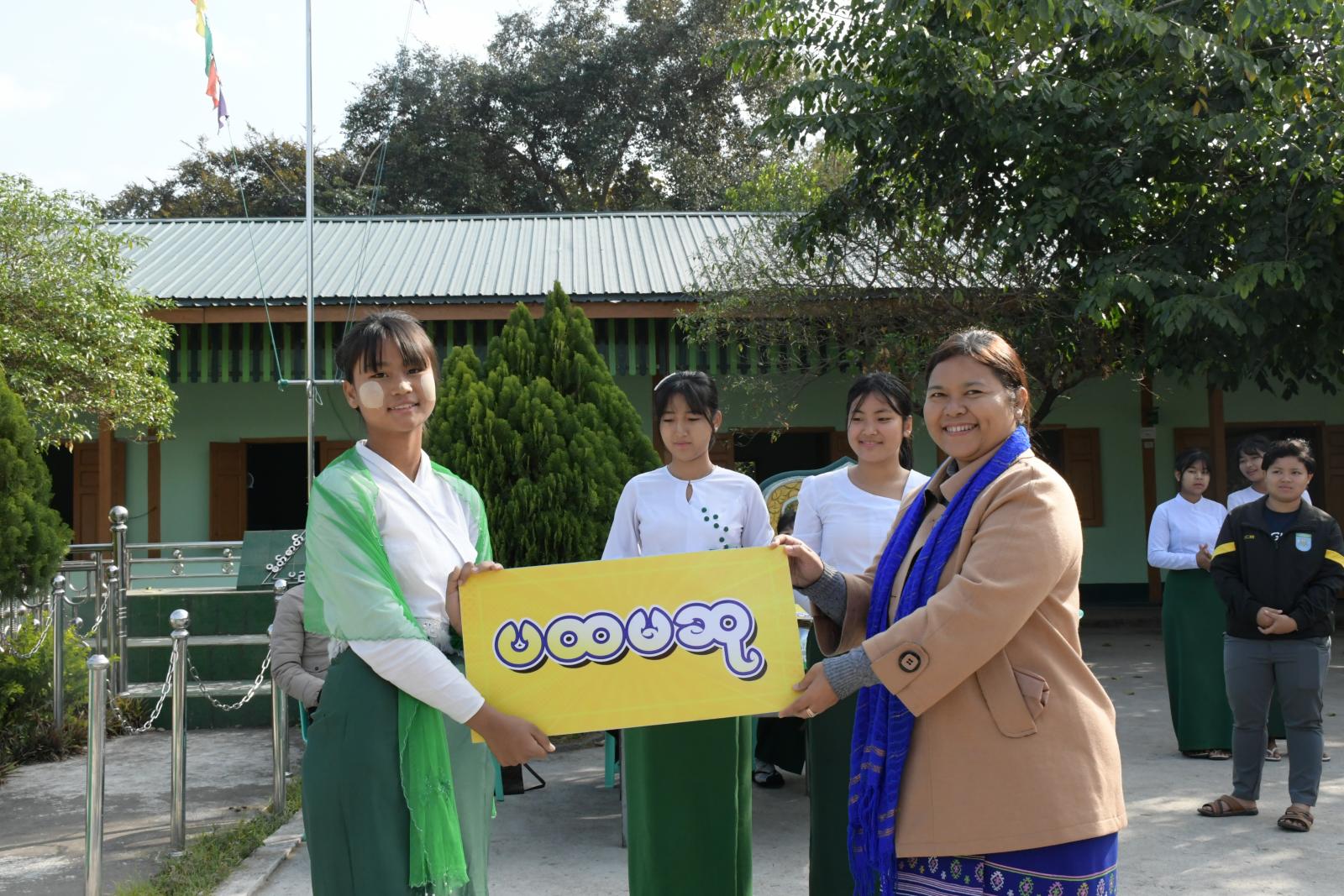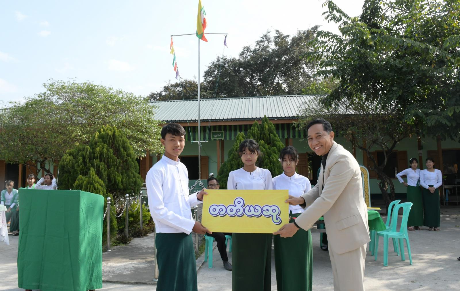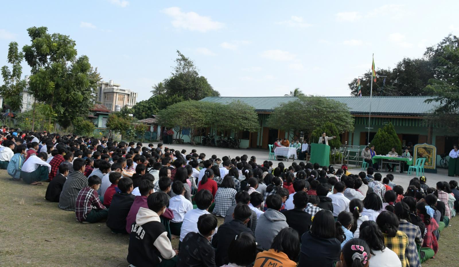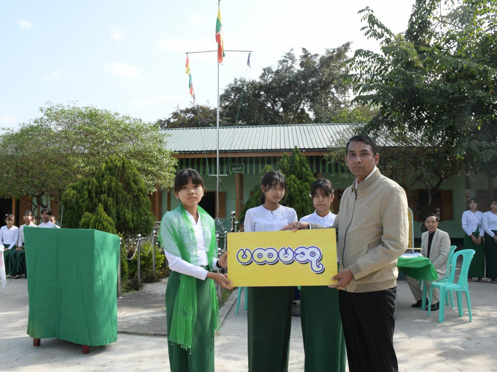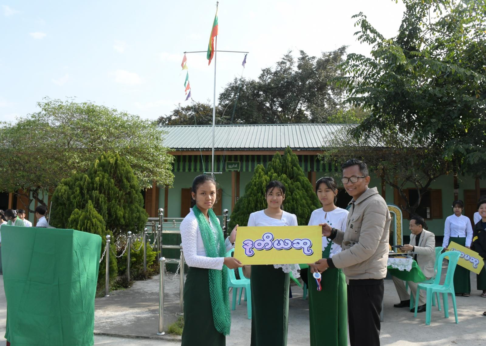 ကချင်ပြည်နယ်လူငယ်ရေးရာအဖွဲ့ဖြင့် ကြီးမှူးကျင်းပသည့် လူငယ်ရေးရာအသိပညာပေး ဟောပြောပွဲနှင့် စာစီစာကုံးပြိုင်ပွဲ ဆုရကျောင်းသား/ကျောင်းသူများအား ဆုချီးမြှင့်ပွဲ အခမ်းအနားကို မြစ်ကြီးနားမြို့၊ အမှတ် (၁၁) အခြေခံပညာအထက်တန်းကျောင်းဝင်းအတွင်းရှိ မြက်ခင်းပြင်၌ ဖေဖော်ဝါရီ ၉ ရက် နံနက် ၉ နာရီခွဲက ကျင်းပပြုလုပ်ရာ ကျောင်းအုပ်ဆရာမကြီး ဒေါ်သင်းသင်းကြူက အဖွင့်အမှာစကားပြောကြားသည်။