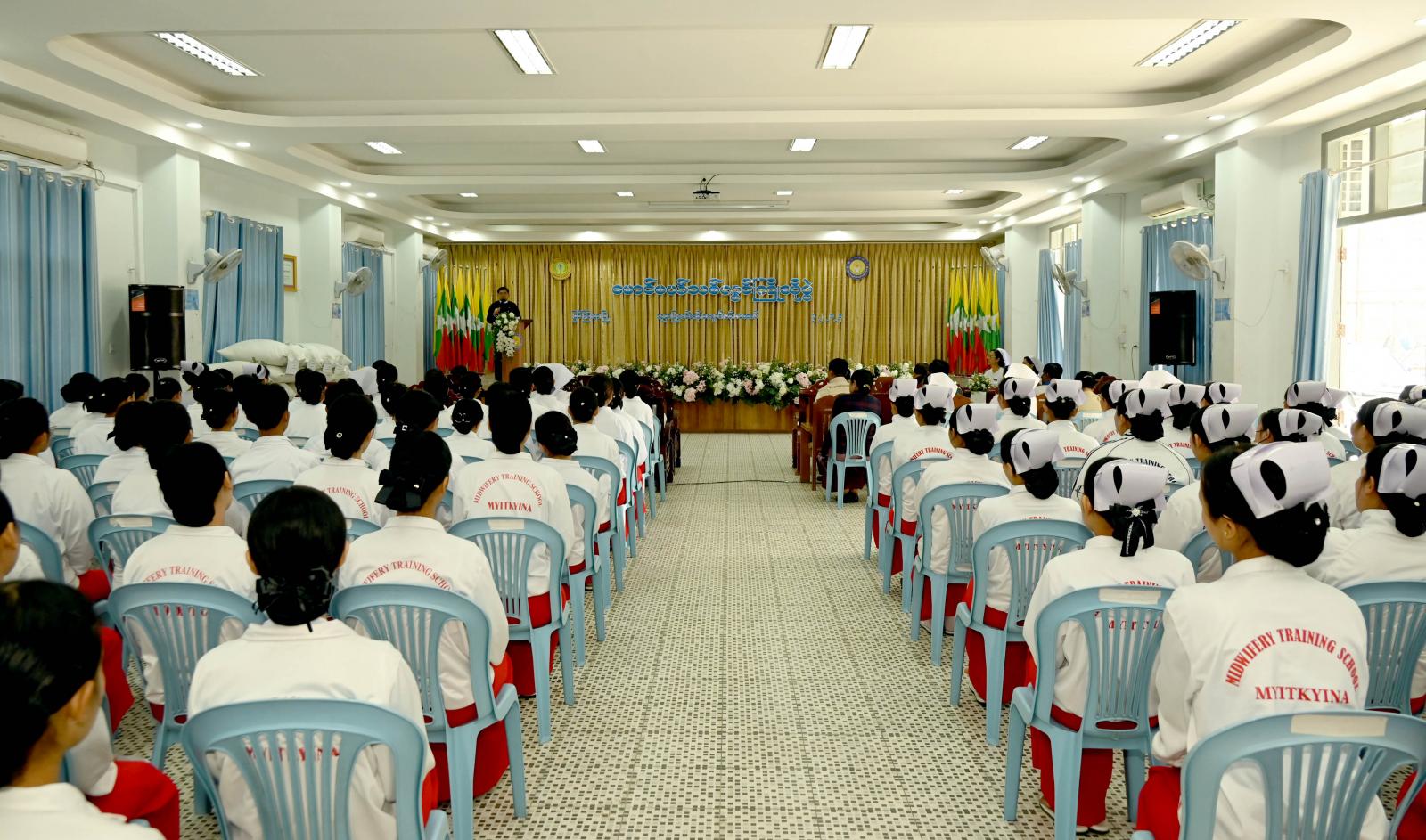 ထို့နောက် ပြည်နယ်အစိုးရအဖွဲ့ဝင် လူမှုရေးရာဝန်ကြီးဦးသန့်ဇင်ကိုကိုက သင်တန်းတက်ရောက်ကြမည့် မောင်မယ်သစ်လွင်(၇၇)ဦးတို့အတွက် ထောက်ပံ့ငွေကျပ် ၂၅ သိန်းကိုလည်းကောင်း၊ မြစ်ကြီးနား ကုတင်-၅၀၀ ဆံ့ပြည်သူ့ဆေးရုံအုပ်ကြီးက အာဟာရအတွက် ကြက်ဥများကိုလည်းကောင်း၊ အလှူရှင်ဦးလောဆန်းက ဆန်အိတ်များကိုလည်းကောင်း ကျောင်းအုပ်ထံ အသီးသီးထောက်ပံ့ပေးအပ်ကြရာ သူနာပြု-သားဖွားဒီပလိုမာ ပထမနှစ်တက်ရောက်မည့် သင်တန်းသား၊ သင်တန်းသူများကိုယ်စား သင်တန်းသူတစ်ဦးက ကျေးဇူးတင်စကားပြောကြားသည်။