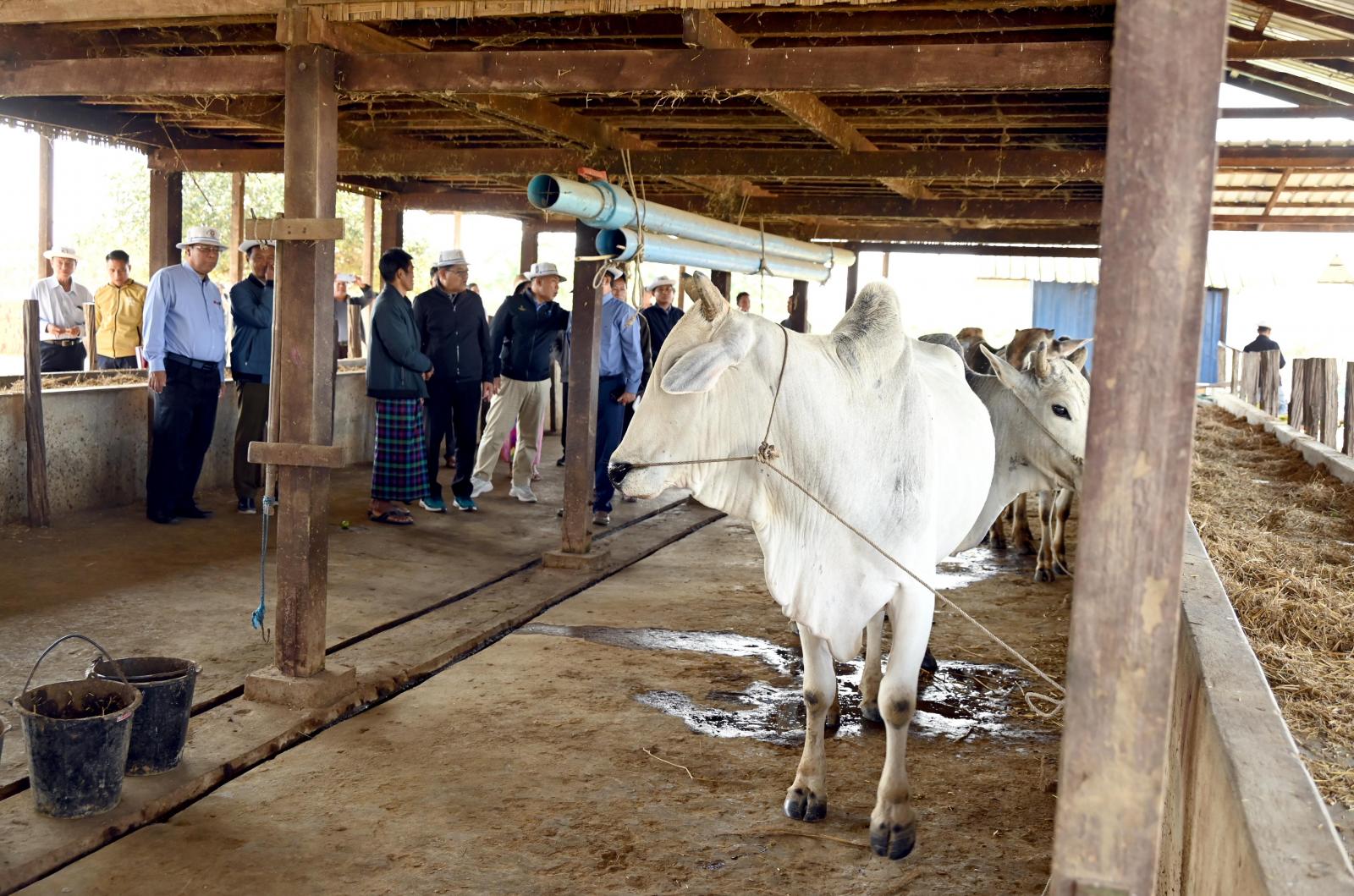 ထိုသို့ ကွင်းဆင်းစစ်ဆေးရာတွင် ပြည်နယ်ဝန်ကြီးချုပ်သည် ပြည်နယ်အစိုးရအဖွဲ့ဝင်လုံခြုံရေးနှင့် နယ်စပ်ရေးရာဝန်ကြီး ဗိုလ်မှူးကြီးကျော်သူရ၊ သယံဇာတရေးရာဝန်ကြီး ဦးတိန့်ဆောင်၊ နိုင်ငံ့စီးပွားမြှင့်တင်ရေးရန်ပုံငွေဖြင့် စိုက်ပျိုးမွေးမြူရေးဆောင်ရွက်သော ပြည်နယ်အဆင့် ကျေးရွာစီမံကိန်းကြီးကြပ်မှုကော်မတီအဖွဲ့ဝင် ပြည်နယ်အဆင့် ဌာနဆိုင်ရာတာဝန်ရှိသူများနှင့်အတူ ပမ္မတီးရပ်ကွက် ရွှေအိုက်ကွင်းအတွင်းရှိ ဦးယိန်းယော်၏ ဘက်စုံစိုက်ပျိုးမွေးမြူရေးခြံအတွင်း ဒေသနွားများနှင့် ဒေသဆိတ်များအား ခြံလှောင်စနစ်ဖြင့် မွေးမြူထားရှိမှုအခြေအနေများ၊ အသားတိုးဝက်များ မွေးမြူထားရှိမှုနှင့် ငါးကန်အတွင်း ငါးများမွေးမြူထားရှိမှုအခြေအနေများကို လှည့်လည်ကြည့်ရှုစစ်ဆေးသည်။