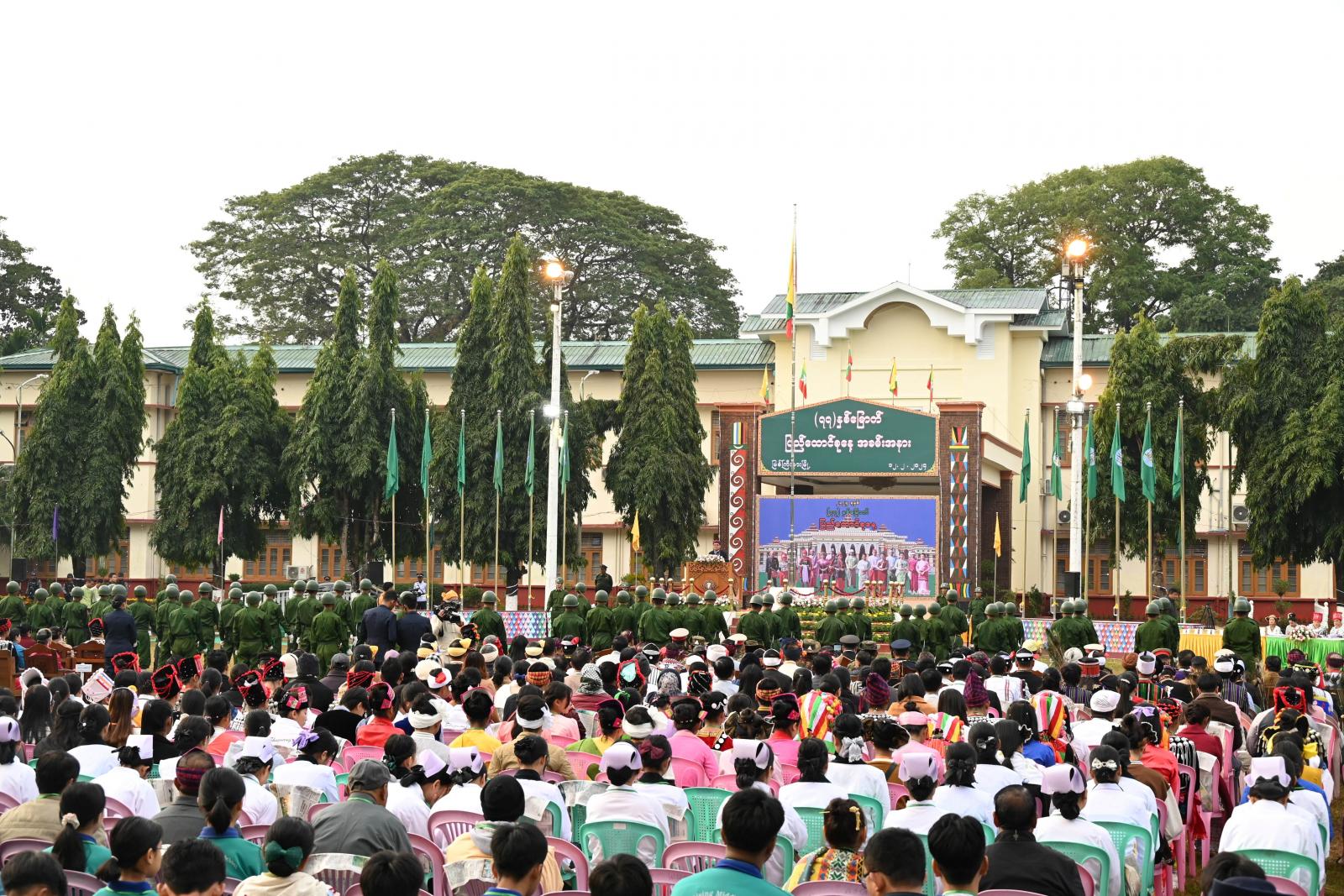 ရှေးဦးစွာ နံနက် ၅ နာရီခွဲတွင် ပြည်နယ်အစိုးရအဖွဲ့ဝင် လုံခြုံရေးနှင့် နယ်စပ်ရေးရာဝန်ကြီး ဗိုလ်မှူးကြီး ကျော်သူရ ဦးဆောင်၍ ဂုဏ်ပြုတပ်ဖွဲ့ဝင်များ၊ ပြည်နယ်ဝန်ကြီးများ၊ ပြည်နယ်အဆင့် ဌာနဆိုင်ရာတာဝန်ရှိသူများက ပြည်ထောင်စုသမ္မတ မြန်မာနိုင်ငံတော်အလံအား လွှင့်တင်ခဲ့ကြပြီး နိုင်ငံတော်အလံအား အလေးပြုခဲ့ကြသည်။