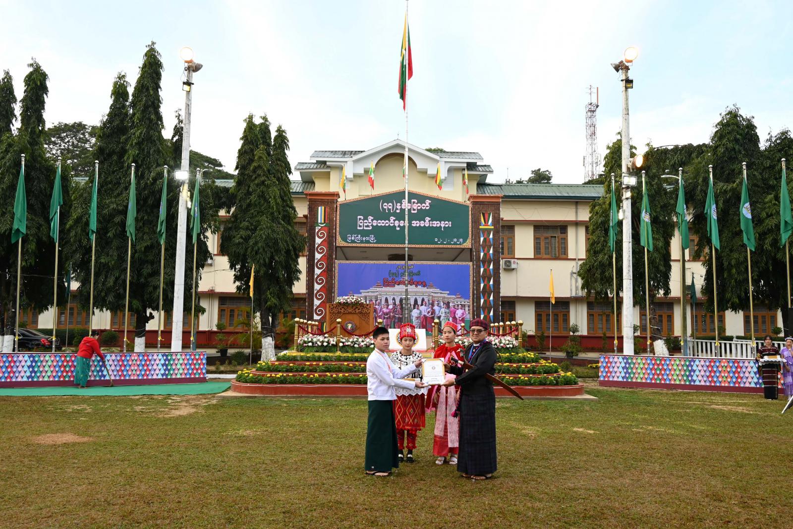 ဆက်လက်၍ ပြည်နယ်ဝန်ကြီးချုပ်၊ ပြည်နယ်တရားလွှတ်တော်တရားသူကြီးချုပ်၊ ဒုတိယတိုင်းမှူး၊ တာဝန်ရှိသူများက (၇၇)နှစ်မြောက် ပြည်ထောင်စုနေ့ အထိမ်းအမှတ် အဆင့်မြင့်ပညာနှင့် အခြေခံ ပညာအဆင့် စာစီစာကုံး၊ ကဗျာ၊ အင်္ဂလိပ်စာနှင့် သင်္ချာစွမ်းရည်ပြိုင်ပွဲများတွင် ဆုရရှိသည့် ကျောင်းသား/ကျောင်းသူများအား ဂုဏ်ပြုမှတ်တမ်းလွှာနှင့် ဂုဏ်ပြုချီးမြှင့်ငွေများကိုလည်းကောင်း၊ ပြည်နယ်ဖွံ့ဖြိုးရေးအတွက် ရန်ပုံငွေများ ထည့်ဝင်လှူဒါန်းပေးသည့် အလှူရှင်များအတွက် ဂုဏ်ပြု မှတ်တမ်းလွှာများကို လည်းကောင်း ချီးမြှင့်ပေးအပ်ခဲ့ကြပြီး တက်ရောက်လာကြသူများနှင့်အတူ အမှတ်တရ စုပေါင်းမှတ်တမ်းတင်ဓာတ်ပုံ ရိုက်ကူးခဲ့ကြသည်။