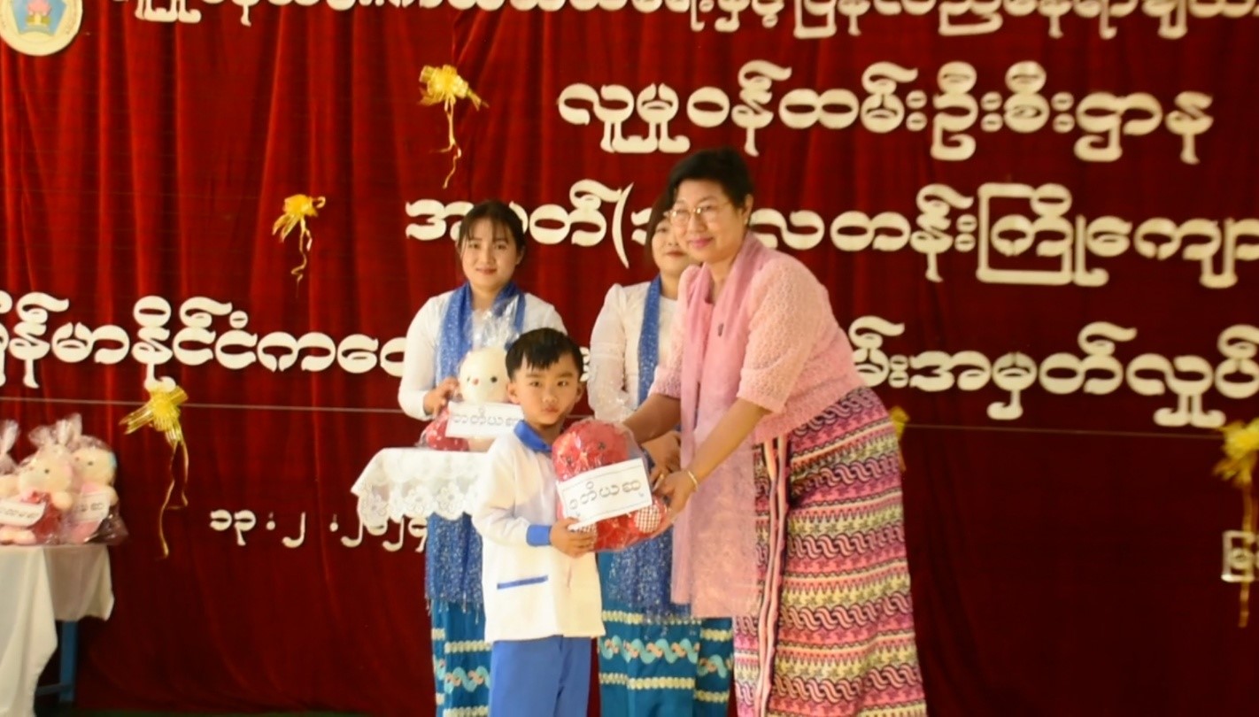 ထို့နောက် ရင်သွေးငယ်ကျောင်းသား/သူလေးများက အကပဒေသာများဖြင့် ဖျော်ဖြေတင်ဆက်ကပြကြရာ တက်ရောက်လာသူများက အားပေးကြည့်ရှုခဲ့ပြီး ဆုချီးမြှင့်ခြင်း အခမ်းအနားကို ကျင်းပပြုလုပ်ရာ ပြည်နယ်လူမှုဝန်ထမ်းဦးစီးဌာနမှူး ညွှန်ကြားရေးမှူးနှင့် တာဝန်ရှိသူများက ပြိုင်ပွဲအမျိုးအစားအလိုက် ဆုရရင်သွေးငယ်များအား အမှတ်တရဆုလက်ဆောင်များ ပေးအပ်ချီးမြှင့်ကာ မြန်မာနိုင်ငံအမျိုးသမီးများနှင့် ကလေးသူငယ်များ ဘဝမြှင့်တင်ရေးအသင်းဥက္ကဋ္ဌ ဒေါ်ခင်လေးမေက မူလတန်းကြိုကျောင်းများအတွက် သင်ထောက်ကူပစ္စည်းများ ထောက်ပံ့ပေးအပ်ရာ မူလတန်းကြိုကျောင်းအလိုက် တာဝန်ရှိသူများက လက်ခံရယူ ခဲ့ကြောင်းနှင့် မြန်မာနိုင်ငံကလေးများနေ့အထိမ်းအမှတ် ပျော်ပွဲရွှင်ပွဲနှင့် ပြိုင်ပွဲများတွင် ရင်သွေးငယ် (၈၁) ဦး ပါဝင်ယှဉ်ပြိုင်ခဲ့ပြီး အခမ်းအနားသို့ မြစ်ကြီးနားမြို့ပေါ်ရှိ မူလတန်းကြိုကျောင်းများမှ ကျောင်းအုပ်များ၊ ဆရာမများနှင့် ရင်သွေးငယ်များ၊ ဖိတ်ကြားထားသူများ တက်ရောက်ကြောင်း သတင်းရရှိသည်။