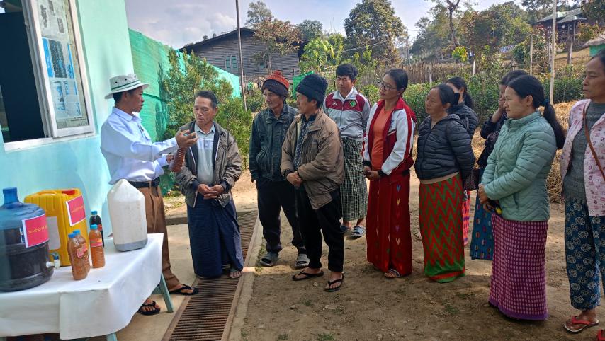ထို့နောက် တက်ရောက်လာကြသော တောင်သူများအား တန်ဖိုးနည်းသဘာဝမြေဩဇာပြုလုပ်ရာတွင်လည်းကောင်း၊ သီးပင်စားပင်များအား ဆေးအဖြစ်လည်းကောင်း၊ တိရစ္ဆာန်မွေးမြူရေးများတွင် အနံ့အသက်ကာကွယ်ရေးအတွက် အသုံးပြုနိုင်သော အသင့်သုံး EM ဖျော်ရည်ပြုလုပ်နည်းနှင့် အသုံးပြုနည်းသရုပ်ပြခြင်းတို့ကို ဆောင်ရွက်ပြီး အသင့်သုံး EM ဖျော်ရည်များကို အခမဲ့ဖြန့်ဝေပေးခဲ့ကြောင်း သိရသည်။