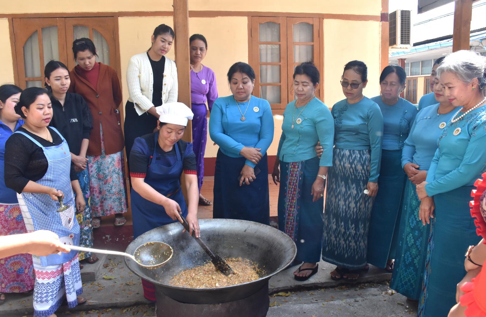 ထို့နောက် ရိုးရာအစားအစာချက်ပြုတ်နည်းသင်တန်းအား ဆက်လက်ဖွင့်လှစ်ပြီး ရိုးရာအစားအစာ ချက်ပြုတ်နည်း သင်တန်းနည်းပြမှ ကြက်ကချင်ချက်၊ ဝက်ကချင်ချက်၊ စီပါ၊ ပိန်းဥဟင်းရည်နှင့် ငါးဂျူးမြစ်ထောင်းအစရှိသည့် ကချင်ရိုးရာအစားအစာ ချက်ပြုတ်နည်းများအား စာတွေ့လက်တွေ့ သင်ကြားပေးရာ ပြည်နယ်အမျိုးသမီးရေးရာအဖွဲ့နှင့် မိခင်နှင့်ကလေးစောင့်ရှောက်မှု ကြီးကြပ်ရေး အဖွဲ့နာယက ပြည်နယ်ဝန်ကြီးချုပ်၏ဇနီးသည် ပြည်နယ်ဝန်ကြီးများ၏ ဇနီးများ၊ ခရိုင်/မြို့နယ် အမျိုးသမီးရေးရာအဖွဲ့နှင့် မိခင်နှင့်ကလေးစောင့်ရှောက်မှု ကြီးကြပ်ရေးအဖွဲ့ဝင်များ အထွေထွေအုပ်ချုပ်ရေးဦးစီးဌာနမှ ဝန်ထမ်းများနှင့်အတူ လက်တွေ့ချက်ပြုတ်ခဲ့ကြကာ ချက်ပြုတ်ထားသည့် ဟင်းလျာများအားအတူတကွ သုံးဆောင်ခဲ့ကြကြောင်း သိရသည်။
