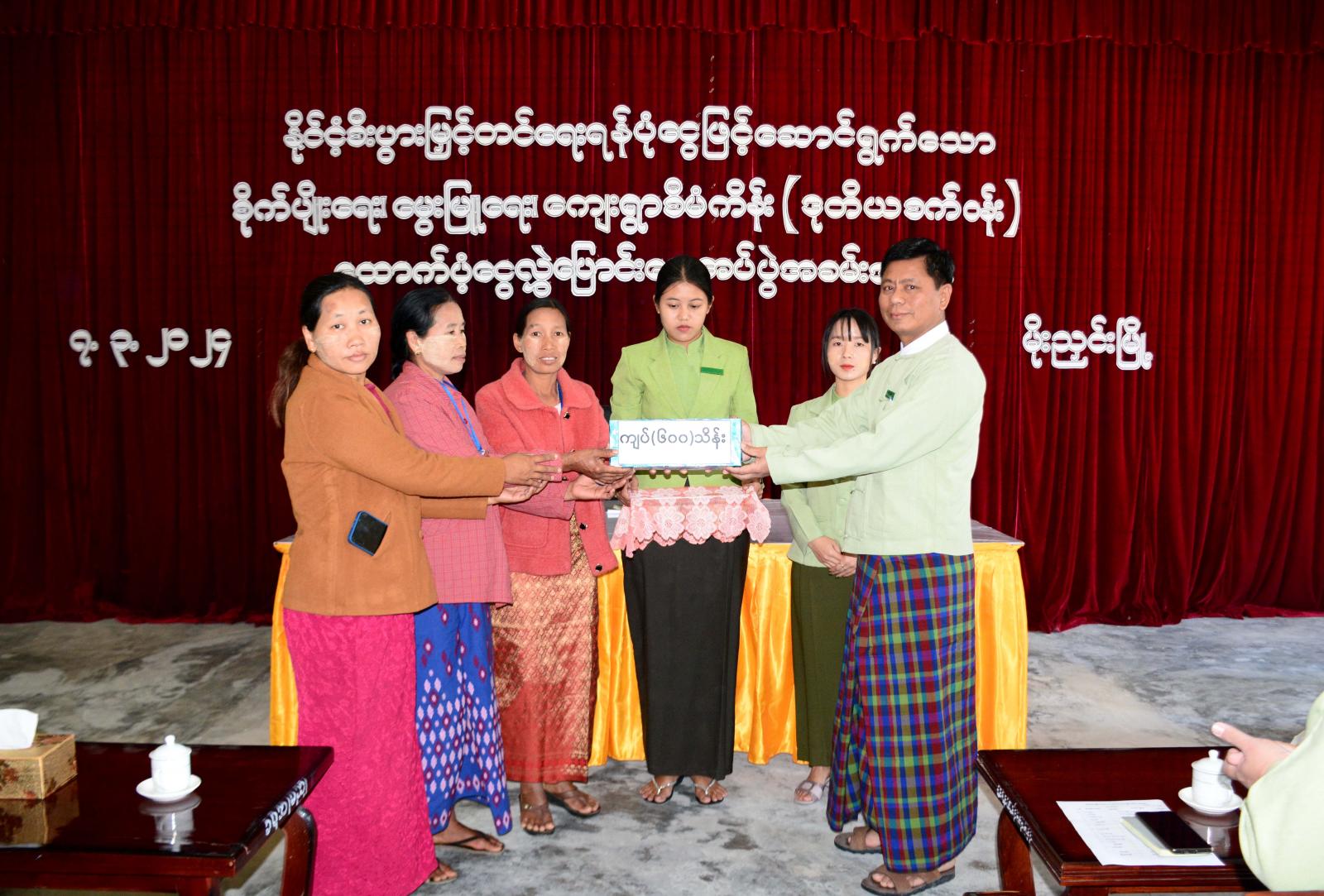 ထို့နောက် တက်ရောက်လာကြသည့် ကျေးရွာစီမံကိန်း ကော်မတီဝင်များအား သက်ဆိုင်ရာ တာဝန်ရှိသူများက စိုက်ပျိုးရေးလုပ်ငန်းဖြင့် အကောင်အထည်ဖော် ဆောင်ရွက်နေသည့် စီမံကိန်းကျေးရွာ (၄) ရွာသို့ ထောက်ပံ့ငွေကျပ် သိန်း(၁၈၀၀)ကိုလည်းကောင်း၊ သမဝါယမလုပ်ငန်း ဆောင်ရွက်နေသည့် စီမံကိန်းကျေးရွာ (၆)ရွာသို့ ထောက်ပံ့ငွေကျပ် သိန်း(၂၂၀၀)ကိုလည်းကောင်း၊ မွေးမြူရေးလုပ်ငန်းဖြင့် အကောင်းအထည်ဖော် ဆောင်ရွက်နေသည့် အုန်းစံဆိုင်စီမံကိန်းကျေးရွာ (၁)ရွာကို ထောက်ပံ့ငွေကျပ် သိန်း(၆၀၀)ကိုလည်းကောင်း စုစုပေါင်း ထောက်ပံ့ငွေကျပ်သိန်း (၄၆၀၀)အား အသီးသီး လွှဲပြောင်းပေးအပ်ခဲ့ကြကြောင်း သိရသည်။