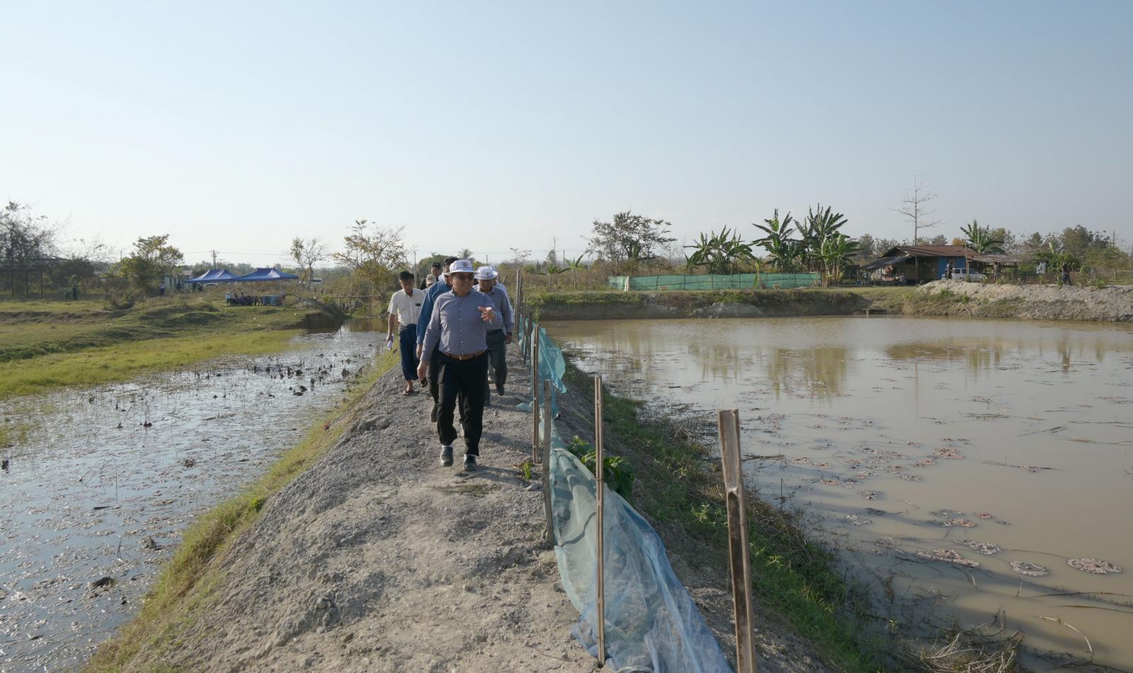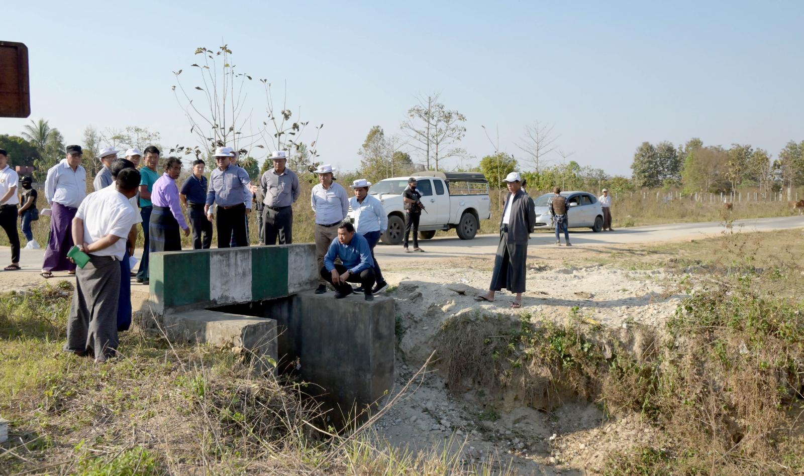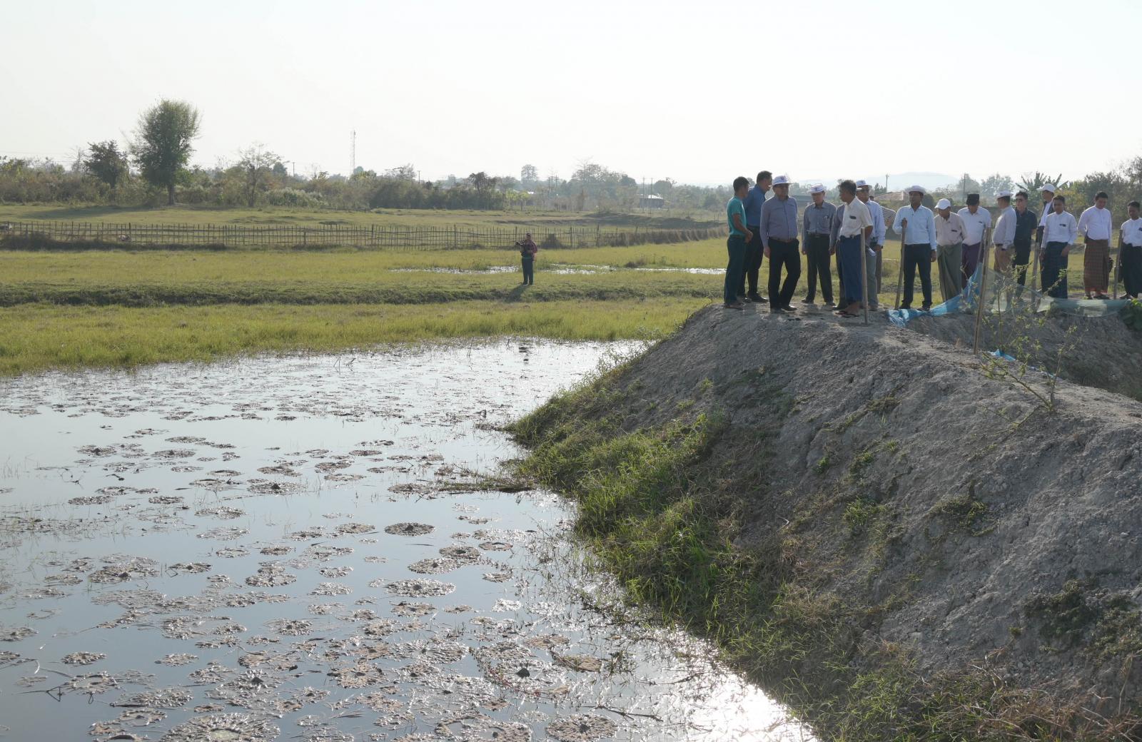ယင်းနောက် ကွင်းအမှတ် (၇၄)အတွင်း နှစ်စဉ် လယ်မြေများ ရေဝပ်တင်ကျန်မှုကြောင့် လယ်သီးနှံစိုက်ပျိုးမှု နည်းပါးသည့် ရေဝပ်ဧရိယာဧက (၇၀)အတွင်း ရေများတင်ကျန်မှု မရှိစေရေးနှင့် ငါးကန်များရေကျော်မှုမဖြစ်ပေါ်စေရေး အဆိုပါဧရိယာမှ နန်းကွေ့ချောင်းအထိ အရှည်ပေ ၃၃၅၀ ရှိသည့် ရေထုတ်မြောင်းအား ပြည်နယ်ဆည်မြောင်းနှင့် ရေအသုံးချမှုစီမံခန့်ခွဲရေးဦးစီးဌာနက ရေစီးရေလာကောင်းမွန်ရေးနှင့် အဆင့်မြှင့်တင်ဆောင်ရွက်နိုင်ရေးအတွက် မြေပြင်ကွင်းဆင်းစစ်ဆေးဆောင်ရွက်ခဲ့မှုများနှင့်စပ်လျဉ်း၍ ရှင်းလင်းတင်ပြမှုအပေါ် အမြန်ဆုံးဆောင်ရွက်နိုင်ရေးနှင့် ရေဝပ်လယ်မြေများတွင် မိုးစပါးဧရိယာ တိုးချဲ့စိုက်ပျိုးနိုင်ရေးအတွက် လှည့်လည်ကြည့်ရှုစစ်ဆေးခဲ့ကြပြီး တောင်သူ ဦးဝရမ်းခေါင်ဒီး၏ ငါးကန်များအား လှည့်လည်ကြည့်ရှုစစ်ဆေးခဲ့ကြကြောင်း သိရသည်။