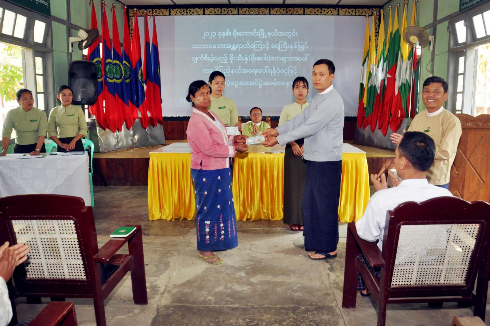ကချင်ပြည်နယ်၊ မိုးညှင်းခရိုင်၊ မိုးကောင်းမြို့နယ်တွင် ၂၀၂၃ ခုနှစ်အတွင်း သဘာဝဘေးအန္တရာယ် ကြောင့် မိုးသီးနှံ (မိုးစပါး) ဧကများ ရေကြီးနစ်မြုပ်ပျက်စီးခဲ့သည့် ကျေးရွာတောင်သူများသို့ ပြည်နယ် အရေးပေါ်ရန်ပုံငွေများ ထောက်ပံ့ပေးအပ်ပွဲကို မြို့နယ်အထွေထွေအုပ်ချုပ်ရေးဦးစီးဌာန အစည်း အဝေးခန်းမ၌ ယမေန်နေ့ မွန်းလွဲ(၁)နာရီက ကျင်းပသည်။