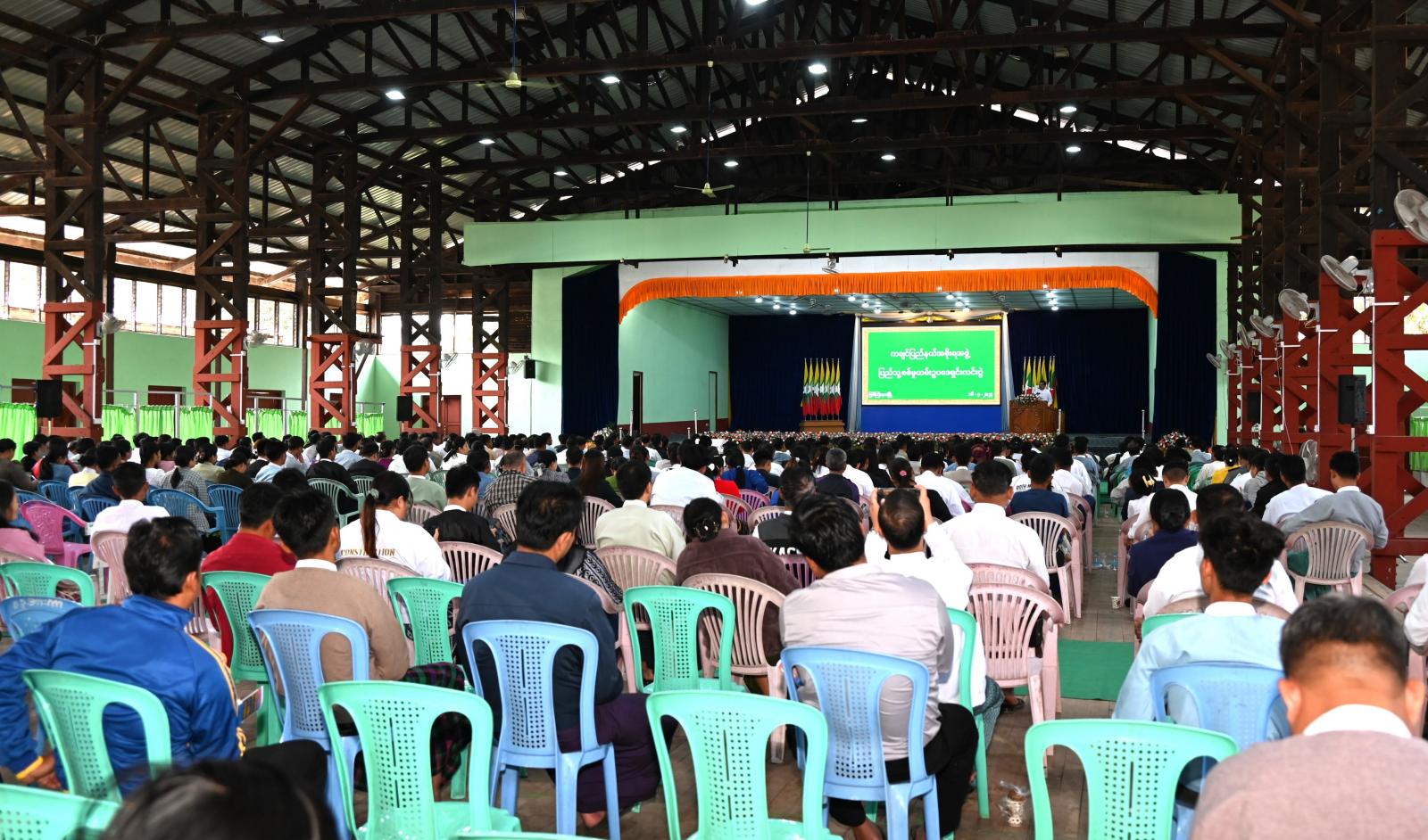 ကချင်ပြည်နယ်၊ မြစ်ကြီးနားမြို့၌ ပြည်နယ်/ ခရိုင်/ မြို့နယ် အရာထမ်း/ အမှုထမ်း ဝန်ထမ်းများအား ပြည်သူ့စစ်မှုထမ်းဥပဒေနှင့် စပ်လျဉ်း၍ ရှင်းလင်းဆွေးနွေးပွဲအခမ်းအနားကို မတ် ၁၆ ရက် နံနက် ၉ နာရီက ပြည်နယ်ပြည်သူ့အားကစားကွင်းအတွင်းရှိ မိုးလုံလေလုံအားကစားခန်းမ၌ ကျင်းပပြုလုပ်ရာ ပြည်နယ်ဝန်ကြီးချုပ် ဦးခက်ထိန်နန်နှင့် ပြည်နယ်အစိုးရအဖွဲ့ဝင်များ တက်ရောက်ကြသည်။