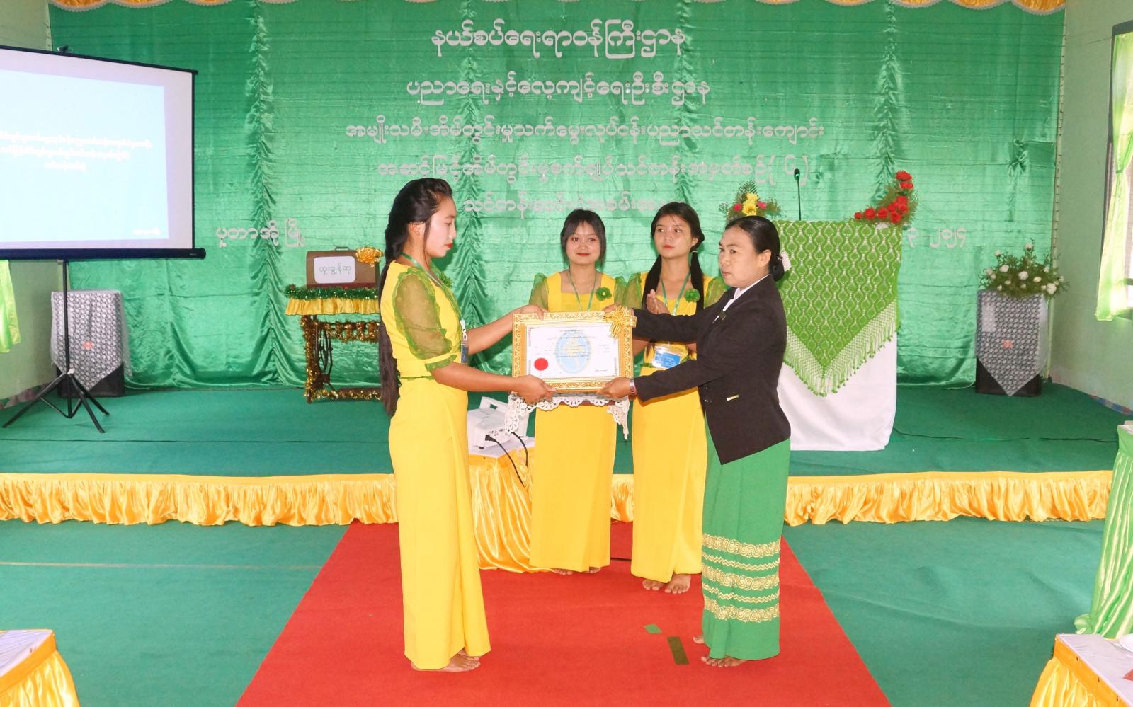 ဆက်လက်၍ ခရိုင်အထွေထွေအုပ်ချုပ်ရေးဦးစီးဌာန ခေတ္တခရိုင်အုပ်ချုပ်ရေးမှူး ဦးသန်းထွေးက သင် တန်းထူးချွန်ဆုရ ပူတာအိုမြို့နယ် ဆထီလော်ကျေးရွာနေ သင်တန်းသူ မညီချယ်ဆာအား လည်းကောင်း၊ ခရိုင်စီမံအုပ်ချုပ်ရေးအဖွဲ့ အတွင်းရေးမှူး ခရိုင်ရဲတပ်ဖွဲ့မှူး ဒုတိယရဲမှူးကြီး သိန်းဆွေညွန့်က သင်တန်းတွင် ပထမဆုရ ခေါင်လန်ဖူးမြို့နေ သင်တန်းသူ မရဲလီဆာအားလည်းကောင်း၊ ခရိုင်ပြန်ကြားရေးနှင့်ပြည်သူ့ဆက်ဆံရေးဦးစီးဌာန ခရိုင်ဦးစီးမှူး ဒေါ်ခင်သူဇာက သင်တန်းတွင် ဒုတိယဆုရ ပူတာအိုမြို့နယ် နမ်ဟော့ကျေးရွာနေ သင်တန်းသူ မနီနီဇာအားလည်းကောင်း ဆုများ အသီးသီး ပေးအပ်ချီးမြှင့်ကြပြီး အမျိုးသမီး အိမ်တွင်းမှုသင်တန်းကျောင်း (ပူတာအို) ကျောင်းအုပ်ဆရာမကြီး ဒေါ်ခင်ဌေးရီက သင်တန်းဆင်း လက်မှတ်များကို သင်တန်း သူတစ်ဦးထံ ပေးအပ်သည်။