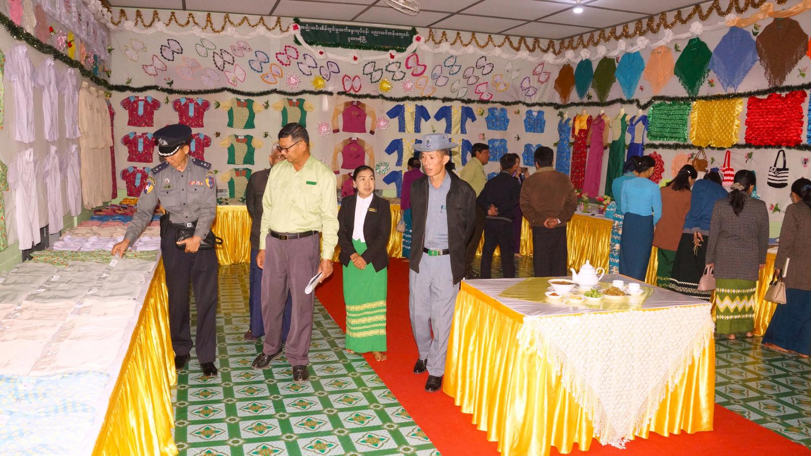 ထို့နောက် သင်တန်းသူများကိုယ်စား သင်တန်းသူတစ်ဦးက သင်တန်းဖွင့်ပေးခြင်းအပေါ် ကျေးဇူးတင်စကား ပြန်လည်ပြောကြားပြီး အခမ်းအနား တက်ရောက်လာသည့် ခေတ္တခရိုင်အုပ်ချုပ်ရေးမှူး၊ ခရိုင်/မြို့နယ်အဆင့် ဌာနဆိုင်ရာများ၊ လူမှုရေးအသင်းအဖွဲ့များ၊ ဖိတ်ကြားထားသော ဧည့်သည်တော်များက သင်တန်းသူများ၏ လက်ရာများ ခင်းကျင်းပြသထားရှိမှုများကို ကြည့်ရှုအားပေးကြရာ သင်တန်းကျောင်းအုပ်ဆရာမကြီးက လိုက်လံရှင်းလင်းပြသသည်။