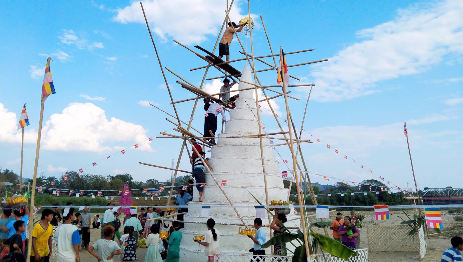 ထို့ကြောင့် ကချင်ပြည်နယ်၊ မိုးညှင်းခရိုင်၊ မိုးကောင်းမြို့ အလယ်ရပ်အောက်ချိုင့် မိုးကောင်းချောင်းဘေး သဲသောင်ပြင်တွင်လည်း တပေါင်းလဆန်း(၁၄)ရက် ယမန်နေ့ ညနေပိုင်းက သဲပုံစေတီ ထီးတော်တင်လှူခဲ့ကြောင်း သိရသည်။