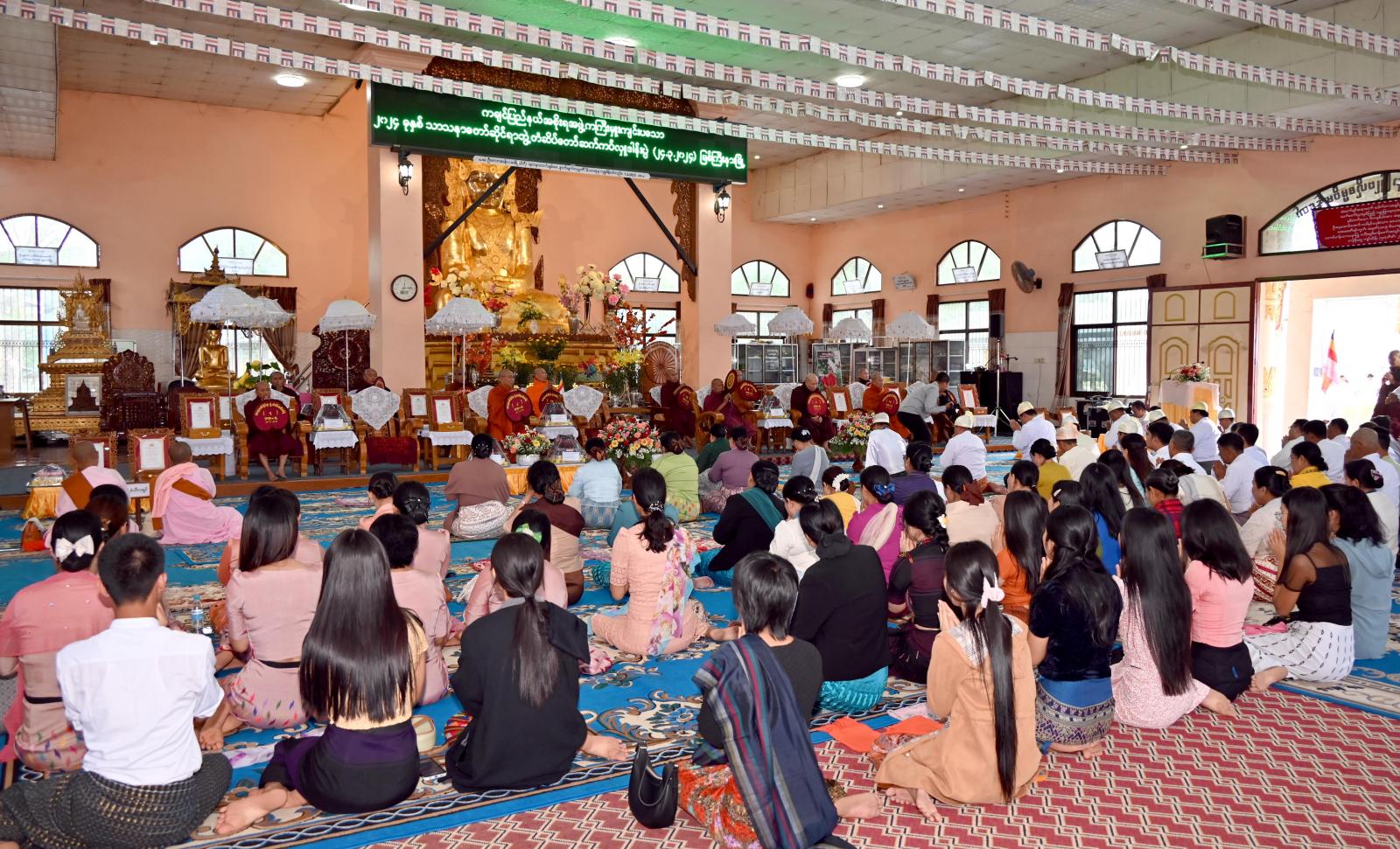 ထို့နောက် ပြည်နယ်သာသနာရေးမှူးက အခမ်းအနားဖွင့်စာတမ်းကို ဖတ်ကြားလျှောက်ထား တင်ပြပြီး ဆရာတော်အရှင်သူမြတ်များထံမှ ပြည်နယ်ဝန်ကြီးချုပ် ဦးခက်ထိန်နန်နှင့်ဇနီး၊ ပြည်နယ် အစိုးရအဖွဲ့ဝင် ဝန်ကြီးများနှင့် ၎င်းတို့၏ဇနီး၊ တပ်မတော် အရာရှိကြီးများနှင့် တက်ရောက်လာကြသည့် ဧည့်ပရိတ်များက ငါးပါးသီလ ခံယူဆောက်တည်ကြပြီး မဟာသန္ဓမဇောတိကဓဇ ဘဒ္ဒန္တဂုဏာ လင်္ကာရ ဘွဲခံဆရာတော်က သမ္မောဒနီယသြဝါဒကထ မြွက်ကြားတော်မူသည်။