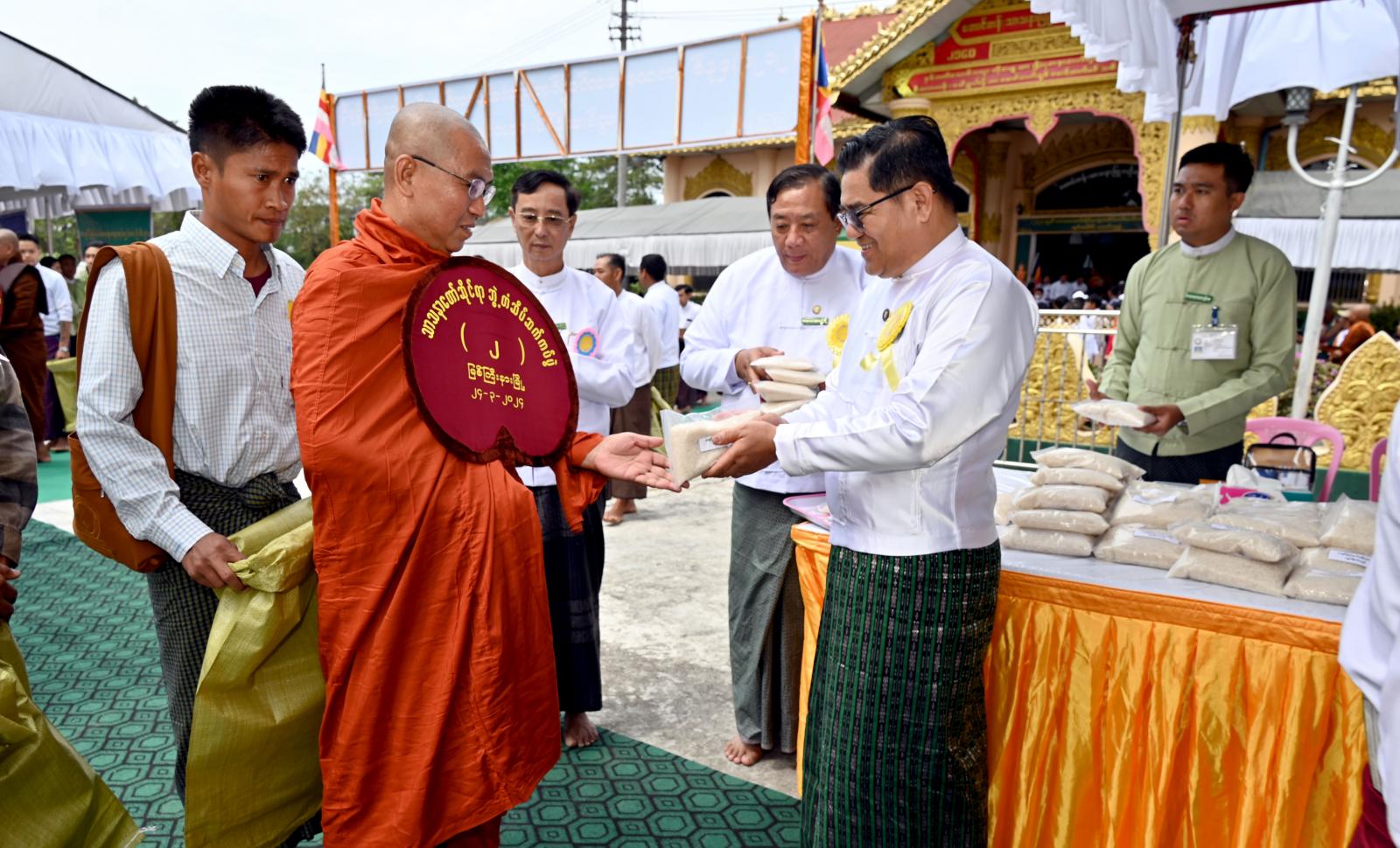 ယင်းနောက် ပြည်နယ်အစိုးရအဖွဲ့ဝင် လူမှုရေးရာဝန်ကြီးက သာသနာတော်ဆိုင်ရာဘွဲ့တံဆိပ် တော်များ ဆက်ကပ်လှူဒါန်းရခြင်းနှင့် သာသနာရေးဆိုင်ရာများကို လျှောက်ထားတော်မူပြီး ဘွဲ့တံဆိပ်တော်များ ဆက်ကပ်လှူဒါန်းရာ ပြည်နယ်ဝန်ကြီးချုပ်နှင့်ဇနီး၊ မြောက်ပိုင်းတိုင်းစစ်ဌာနချုပ် တပ်နယ်မှူး ဗိုလ်မှူးချုပ်တင်ထွန်းနှင့် ဇနီး၊ ပြည်နယ်ဝန်ကြီးများနှင့် ၎င်းတို့၏ ဇနီးများ၊ ပြည်နယ် ဥပဒေချုပ်၊ ပြည်နယ်အစိုးရအဖွဲ့ အတွင်းရေးမှူးတို့က ပင့်သံဃာတော်များနှင့် နိုင်ငံတော်စီမံအုပ်ချုပ် ရေးကောင်စီ၏ အမိန့်ကြေငြာစာအမှတ် (၁/၂၀၂၄)ဖြင့် သာသနာတော်ဆိုင်ရာ ဘွဲ့တံဆိပ်တော်ရ သည့် မဟာသဒ္ဒမဇောတိကဓဇ ဘွဲ့ခံဆရာတော် (၂)ပါး၊ မဟာဂန္ထဝါစကပဏ္ဍိတဘွဲခံ ဆရာတော် တစ်ပါး၊ ဂန္ထဝါစကပဏ္ဍိတဘွဲ့ခံ ဆရာတော် တစ်ပါး၊ သဒ္ဓမ္မဇောတိကဓဇ ဘွဲ့ခံ ဆရာတော် (၄)ပါး၊ ကမ္မဌာနစရိယ ဘွဲ့ခံ ဆရာတော် တစ်ပါး စုစုပေါင်းဘွဲ့ခံ ဆရာတော် (၉)ပါးနှင့် သီဟသုဓမ္မမဏိ ဇောတဓရ၊ သဒ္ဓမ္မဇောတိကဓဇဘွဲ့ခံ လူပုဂ္ဂိုလ် နှစ်ဦး၊ မဟာသဒ္ဒမ္မဇောတိကဓဇ၊ ဂနထဝါစကပဏ္ဍိတ ဘွဲ့ခံ သီလရှင်ဆရာကြီး နှစ်ပါးတို့အား ဘွဲ့တံဆိပ်တော်၊ အဆောင်အယောင်နှင့် လှူဖွယ်ပစ္စည်းများ အသီးသီး ဆက်ကပ်လှူဒါန်းခဲ့ကြသည်။