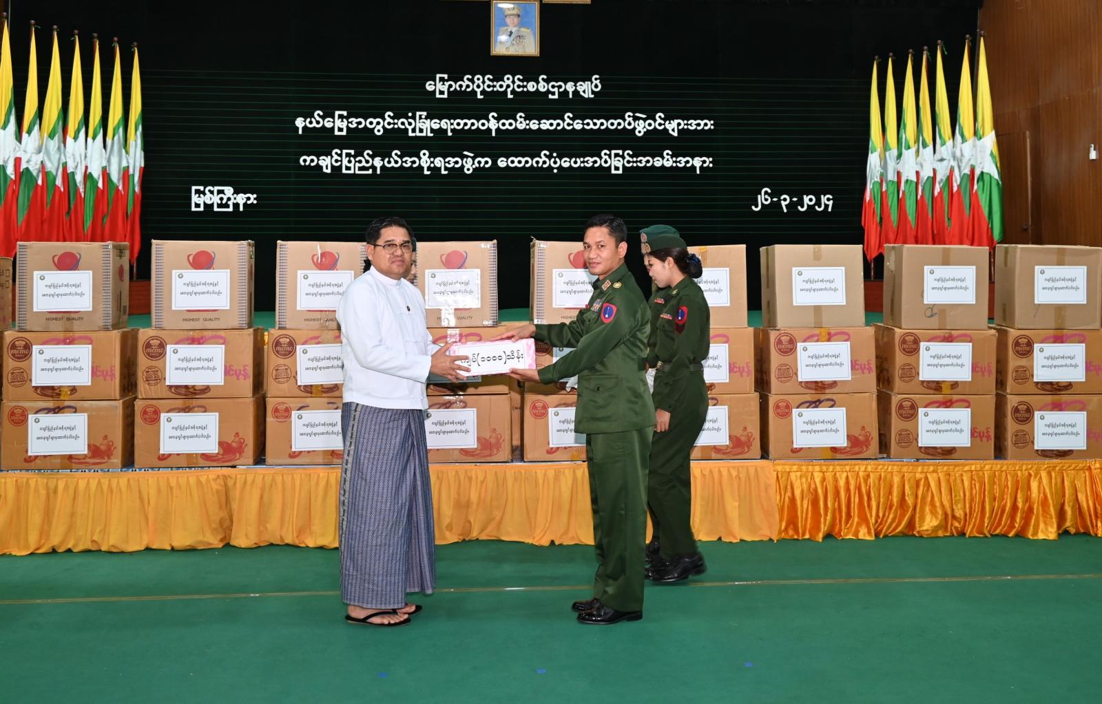 ထို့နောက် ပြည်နယ်အစိုးရအဖွဲ့ဝင် လူမှုရေးရာဝန်ကြီးက ပြည်နယ်အစိုးရအဖွဲ့၊ ပြည်နယ်တရားလွှတ်တော်၊ ပြည်နယ်ဥပဒေချုပ်ရုံး၊ ဝန်ကြီးဌာနများအလိုက် ဌာနဆိုင်ရာများနှင့် အလှူရှင်များ၏ စုပေါင်းလှူဒါန်းမှုဖြင့် တပ်ဖွဲ့ဝင်ဦးရေ (၁၀၀၀)ဦးတို့အတွက် ငွေကျပ်သိန်း (၁၀၀)တန်ဖိုးရှိ အမယ်စုံ(၈)မျိုးပါအသင့်စားစားသောက်ဖွယ်ရာများကို မြစ်ကြီးနားတပ်နယ်မှူးဗိုလ်မှူးချုပ်တင်ထွန်း ထံလည်းကောင်း၊ ပြည်နယ်ဝန်ကြီးချုပ်က လုံခြုံရေးတပ်ဖွဲ့များအတွက် ပြည်နယ်အစိုးရအဖွဲ့နှင့် အလှူရှင်များမှ စုပေါင်းလှူဒါန်းသည့် ငွေကျပ်သိန်း (၁၀၀၀)ကို တိုင်းမှူးဗိုလ်မှူးချုပ်အောင်ဇော်ထွေး ထံလည်းကောင်း အသီးသီးပေးအပ်လှူဒါန်းကြရာ ကျေးဇူးတင်ဂုဏ်ပြုမှတ်တမ်းလွှာများကို ပြန်လည်ပေးခဲ့ကြပြီးတိုင်းမှူးက ဂုဏ်ပြုချီးမြှင့်ငွေနှင့် အသင့်စား စားသောက်ဖွယ်ရာများ ထောက်ပံ့ပေးအပ်မှုအတွက် ကျေးဇူးတင်ဝမ်းမြောက်ဂုဏ်ယူကြောင်း ပြန်လည်ပြောကြားခဲ့ကြောင်း သိရသည်။