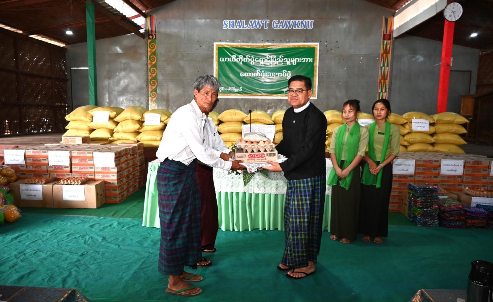 ယင်းနောက် ပြည်နယ်ဝန်ကြီးချုပ်၊ ပြည်နယ်တရားလွှတ်တော်တရားသူကြီးချုပ်နှင့် ပြည်နယ်ဝန်ကြီးများ၊ တာဝန်ရှိသူများက ဝိုင်းမော်မြို့နယ်အတွင်းရှိ အောင်မြင်(၁/၂)၊ ရွှေညောင်ပင်၊ ကဇူး၊ ဒဘတ်ယန်၊ စန်းကား၊ နောင်ဟီး၊ အင်းလေး၊ ရွာသစ်ကျေးရွာများမှ လာရောက်တိမ်းရှောင် ခိုလှုံလျက်ရှိသော အိမ်ထောင်စု စုစုပေါင်း(၂၆၈)စု၊ လူဦးရေ(၁၁၄၁)ဦးတို့အတွက် ကချင်ပြည်နယ်အစိုးရအဖွဲ့က စုစုပေါင်းငွေကျပ်(၉၂၉၄၀၀၀)တန်ဖိုးရှိ ဆန်အိတ်(၆၇)အိတ်ခွဲ၊ ခေါက်ဆွဲခြောက်ဖာ(၂၆၈)ဖာတို့နှင့် ကြက်ဥ(၄၅)လုံးကိုလည်းကောင်း၊ ပြည်နယ်ဘေးအန္တရာယ်ဆိုင်ရာစီမံခန့်ခွဲမှုဦးစီးဌာနက ဆန်ရိက္ခာဖိုး ငွေကျပ်(၆၄၂၁၅၀၀၀)ကိုလည်းကောင်း၊ ပြည်နယ်လူမှုဝန်ထမ်းဦးစီးဌာနက (၃)နှစ်အောက်ကလေး(၄၀၉)ဦးတို့အတွက် ငွေကျပ်(၁၂၂၇၀၀၀၀)၊ အသက်(၇၀)နှစ်နှင့်အထက် ဘိုးဘွား(၂၉၅)ဦးတို့အတွက် (၈၈၅၀၀၀၀)၊ ကိုယ်ဝန်ဆောင်မိခင်(၆၄)ဦးတို့အတွက် ငွေကျပ်(၁၉၂၀၀၀၀)၊ မသန်စွမ်း(၁၁၈)ဦးတို့အတွက် ငွေကျပ်(၃၅၄၀၀၀၀)ကိုလည်းကောင်း၊ မြန်မာနိုင်ငံအမျိုးသမီးများနှင့် ကလေးသူငယ်များဘဝမြှင့်တင်ရေးအသင်း(MWCDF)က ငွေကျပ်(၁၈၉၃၁၀၀) တန်ဖိုးရှိ ဆန်အိတ်(၁၀)အိတ်၊ ခေါက်ဆွဲခြောက်ဖာ(၁၅)ဖာ၊ ကလေးကစားစရာအရုပ်များနှင့် မသန်စွမ်းအမျိုးသမီးများအတွက် အဝတ်အထည်များကိုလည်းကောင်း၊ Humanity Inclusion (HI)က ငွေကျပ်(၄၃၂၀၀၀)တန်ဖိုးရှိ မသန်စွမ်းအမျိုးသားများအတွက် အဝတ်အထည်များကိုလည်းကောင်း၊ ကချင်ပြည်နယ်အမျိုးသမီးများ လူမှုစီးပွားအကျိုးပြုစွမ်းဆောင်ရှင်များအသင်းက ငွေကျပ်(၂၂၄၀၀၀)တန်ဖိုးရှိ ကိုယ်ဝန်ဆောင်မိခင်များအတွက် လုံချည်များကိုလည်းကောင်း စုစုပေါင်း ကချင်ပြည်နယ်အစိုးရအဖွဲ့၊ ဌာနဆိုင်ရာများနှင့်အဖွဲ့အစည်းအသီးသီးက ပစ္စည်းနှင့်ငွေသားတန်ဖိုး (၁၀၂၆၃၈၁၀၀)ကို ထောက်ပံ့ပေးအပ်ခဲ့ကြသည်။